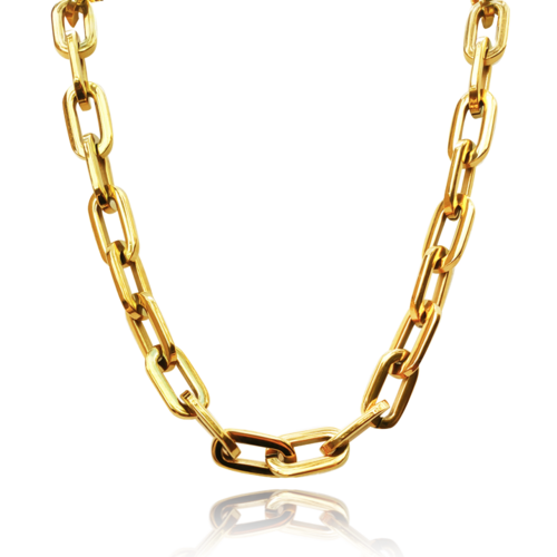 Femininity with strength. Introducing Inara Modern Muse Gold Chain Necklace - a statement neckpiece for modern fashionistas who dare to make their attitude shine. The design features an inter-joined oval shaped wide link chain with a smooth polish and high shine. The necklace is made of environmentally friendly stainless (nickel free) with 3 layers of 18k gold electroplating, forming a thick gold bond to the metal. A quality statement to interpret modern femininity. Perfect for modern, retro, punk, chic, high fashion, smart causal, casual styles and more.