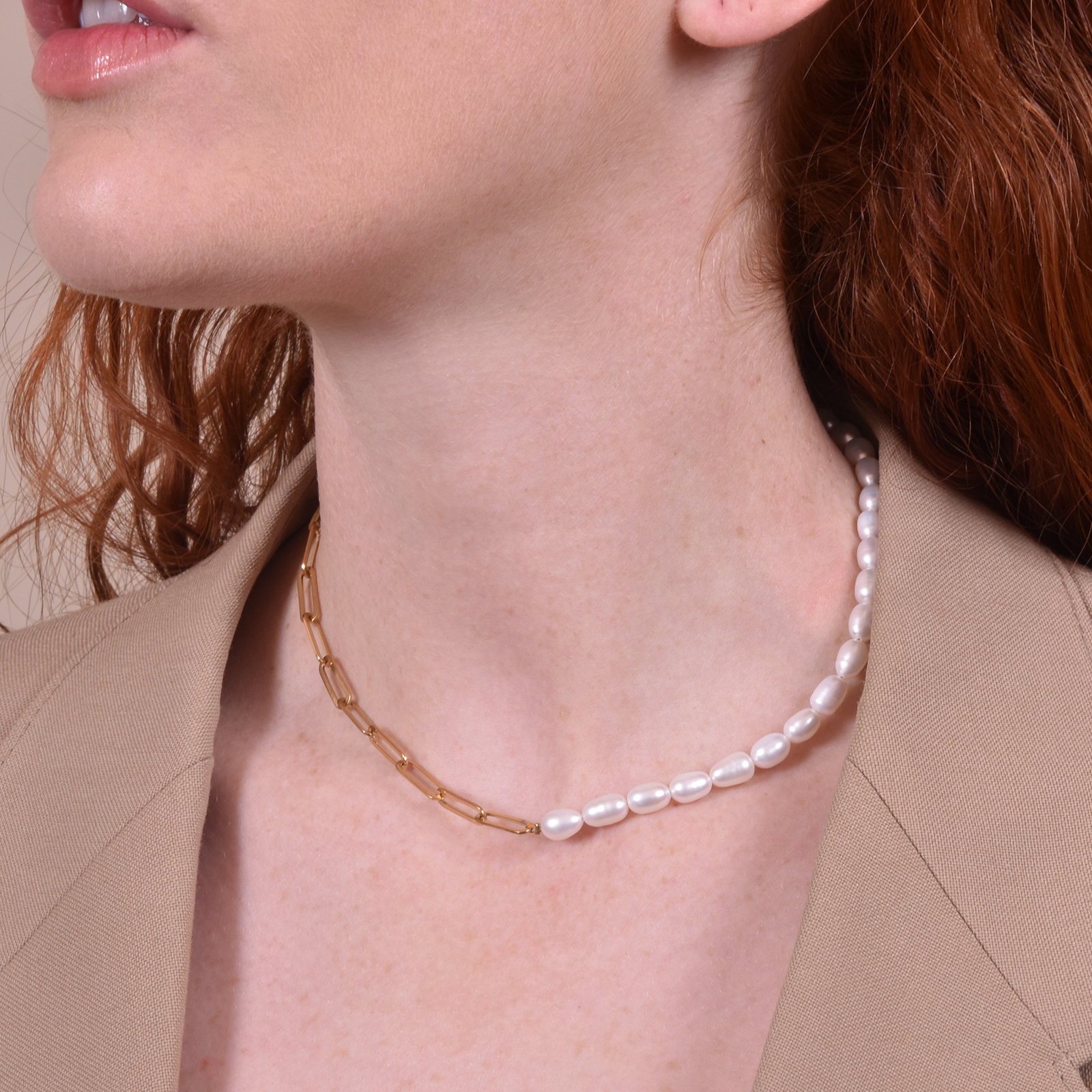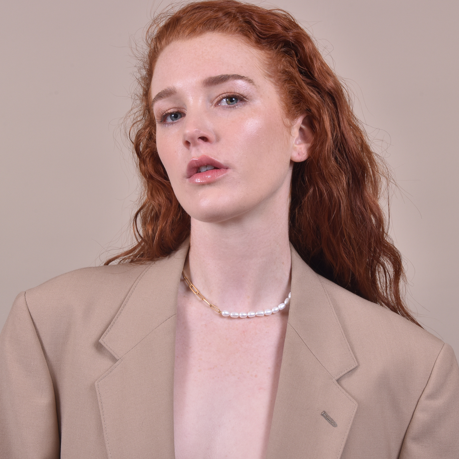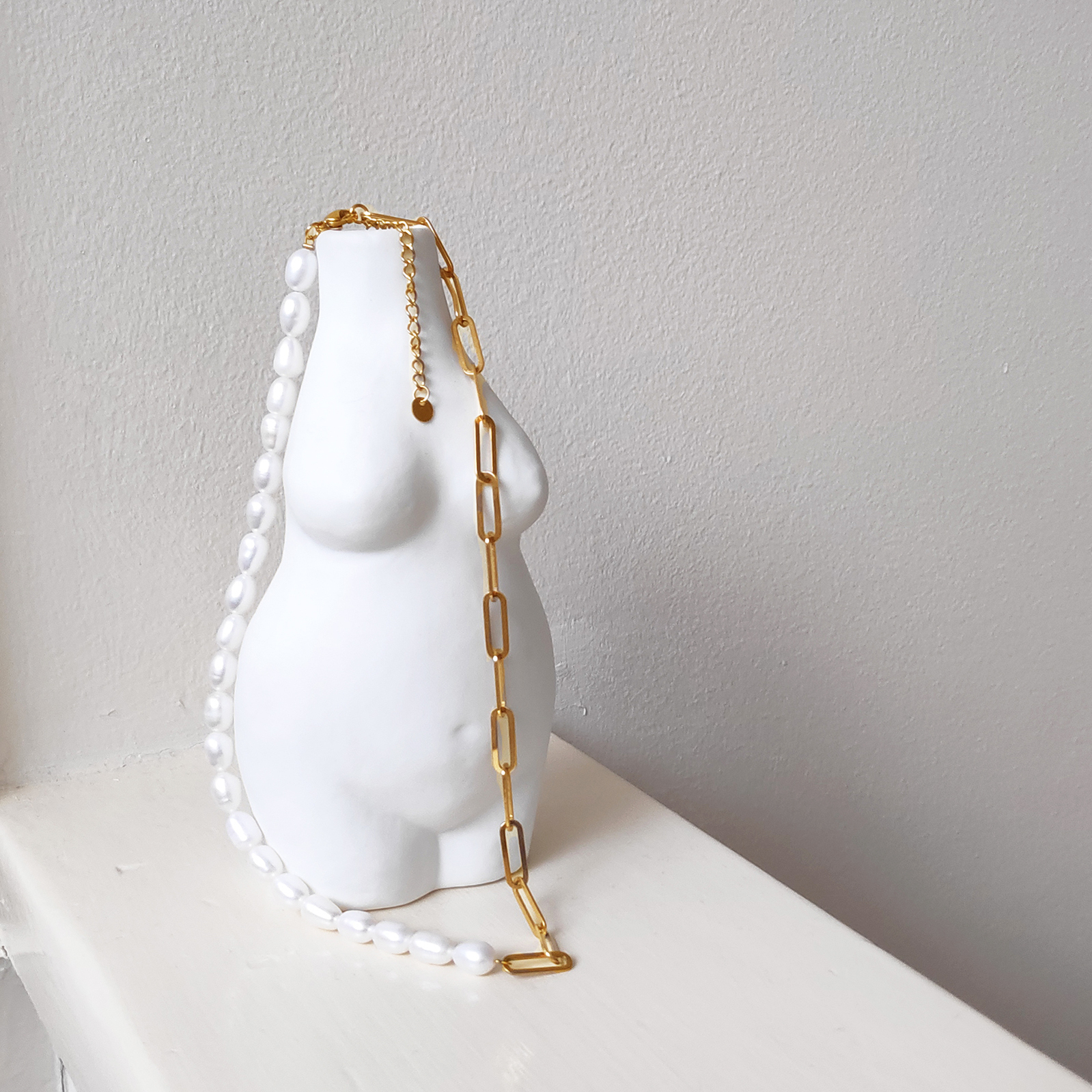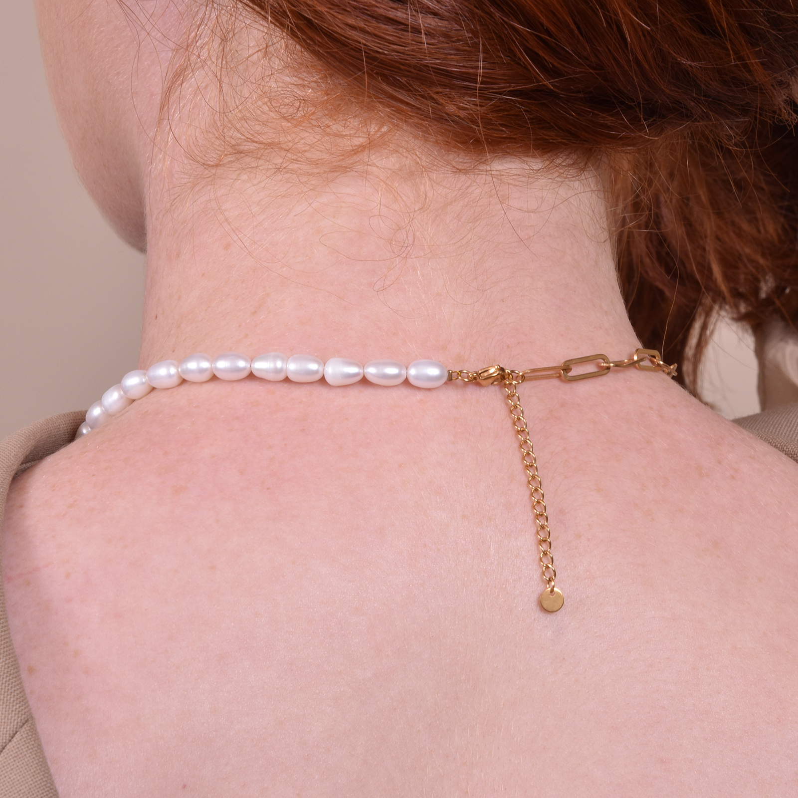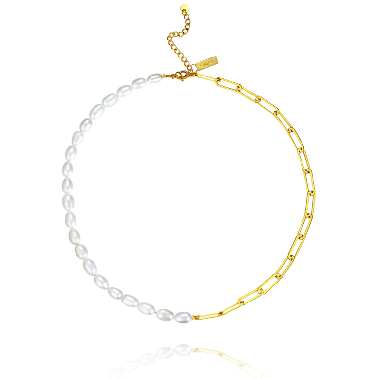 When edginess and elegance well connected, introducing Indira Freshwater Pearl Chain Necklace - a modern and high fashion design threading contemporary and elegant elements into a coherent piece, voicing your new age fashion attitude and statement. This design is ethically crafted in environmentally friendly brass with premium 18K gold plating, paired with hand-picked premium quality freshwater pearls (with smooth surface and fine lustre). Showcase your style with no words needed! Perfect for modern, minimalist, creative, high fashion, runway, fashion events, smart casual, punk, coastal and trendy chic styles. 100% nickel, cadmium and lead free