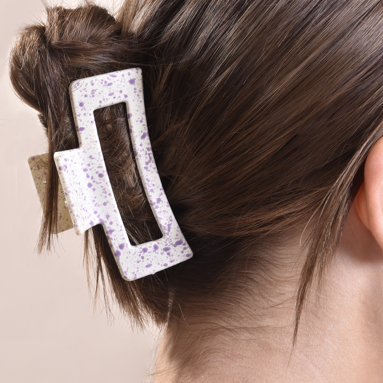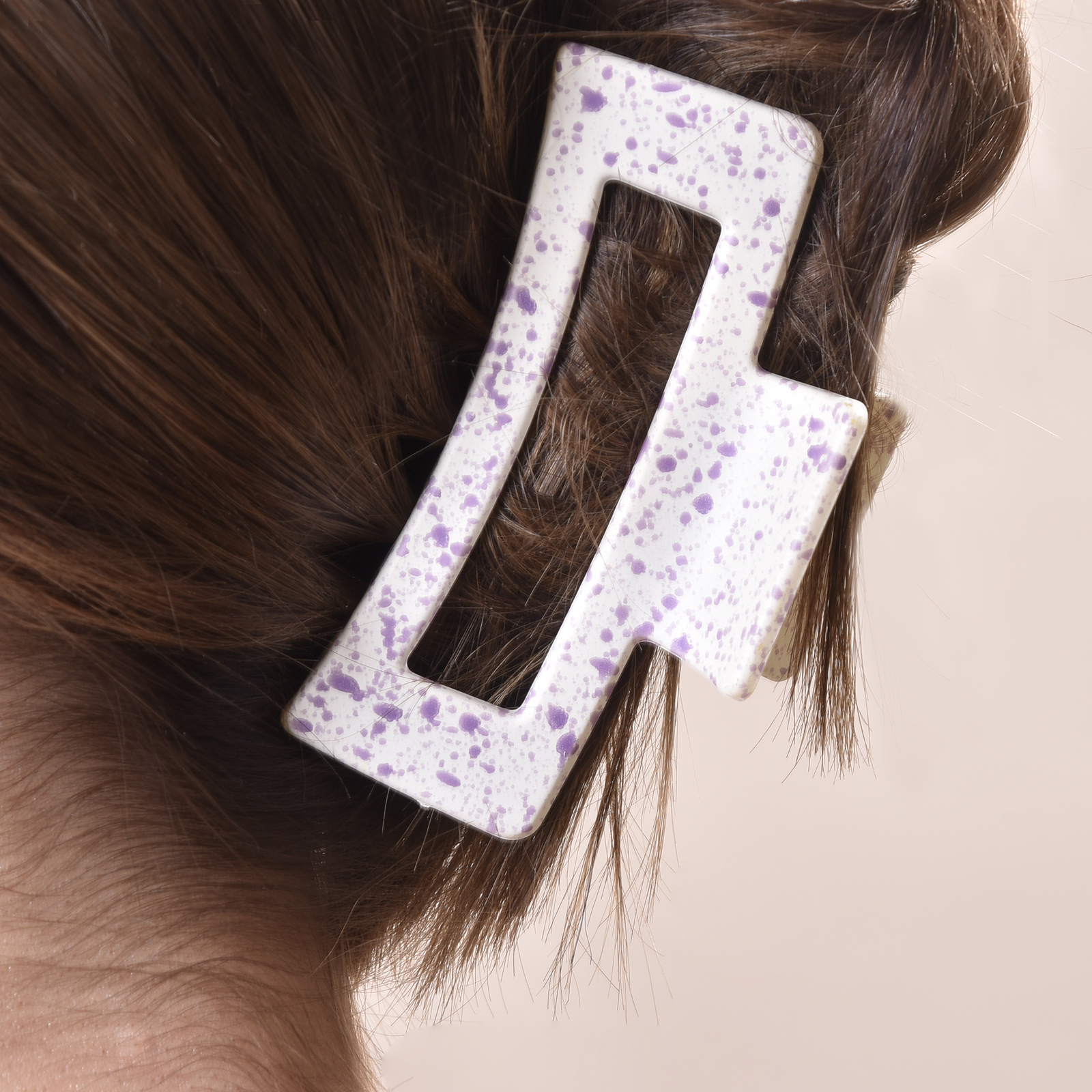 Everyday chicness with a splash of vibrance. Introducing Indy Artsy Paint Splash Claw (Medium) - a day-to-day modern style hair claw to delight your styling. This medium sized claw has a beige base colour with a paint splash pattern in purple. It is easy to clip on and off, adding a quick and stylish touch. Suitable for women and girls of all ages. Also suitable for children.