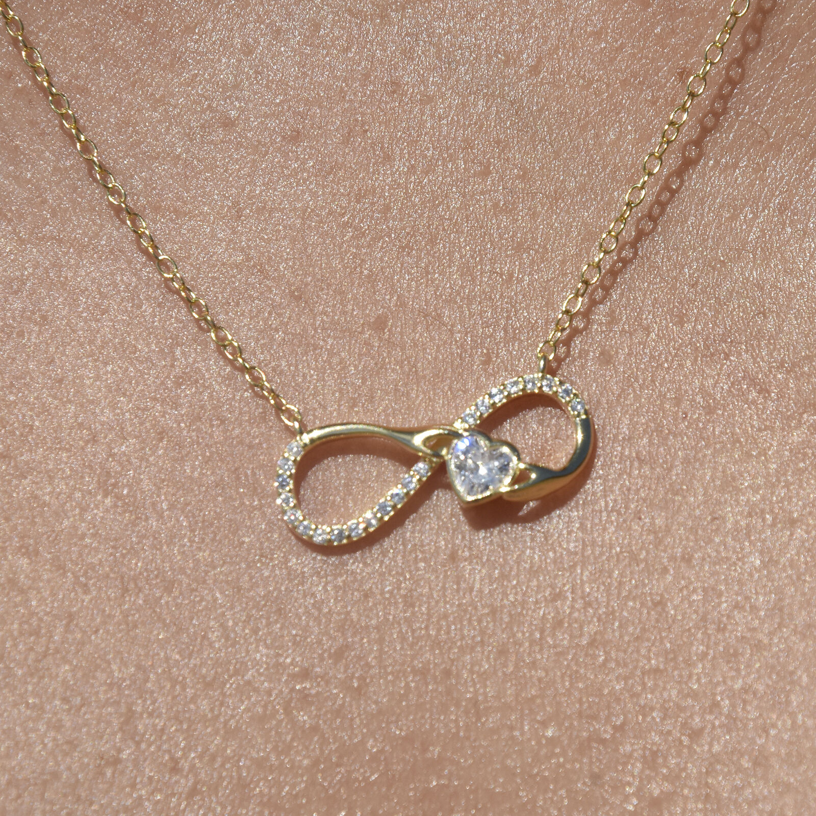 Every field and flower fades, but love is infinite. Introducing Infinite Love Pendant Necklace (Gold) - a joyful reminder that you are full of potential and possibilities. This design features an infinity shaped pendant adorned with Austrian cubic zirconias. This necklace features an adorable highlight of a hand reaching for a heart-shaped zircon embedded on one side. This piece is made in solid sterling silver with 18K gold plating for hypoallergenic and enduring wear. Suitable for girls and women of all ages and personal styles. Hypoallergenic, nickel, lead, and cadmium free.