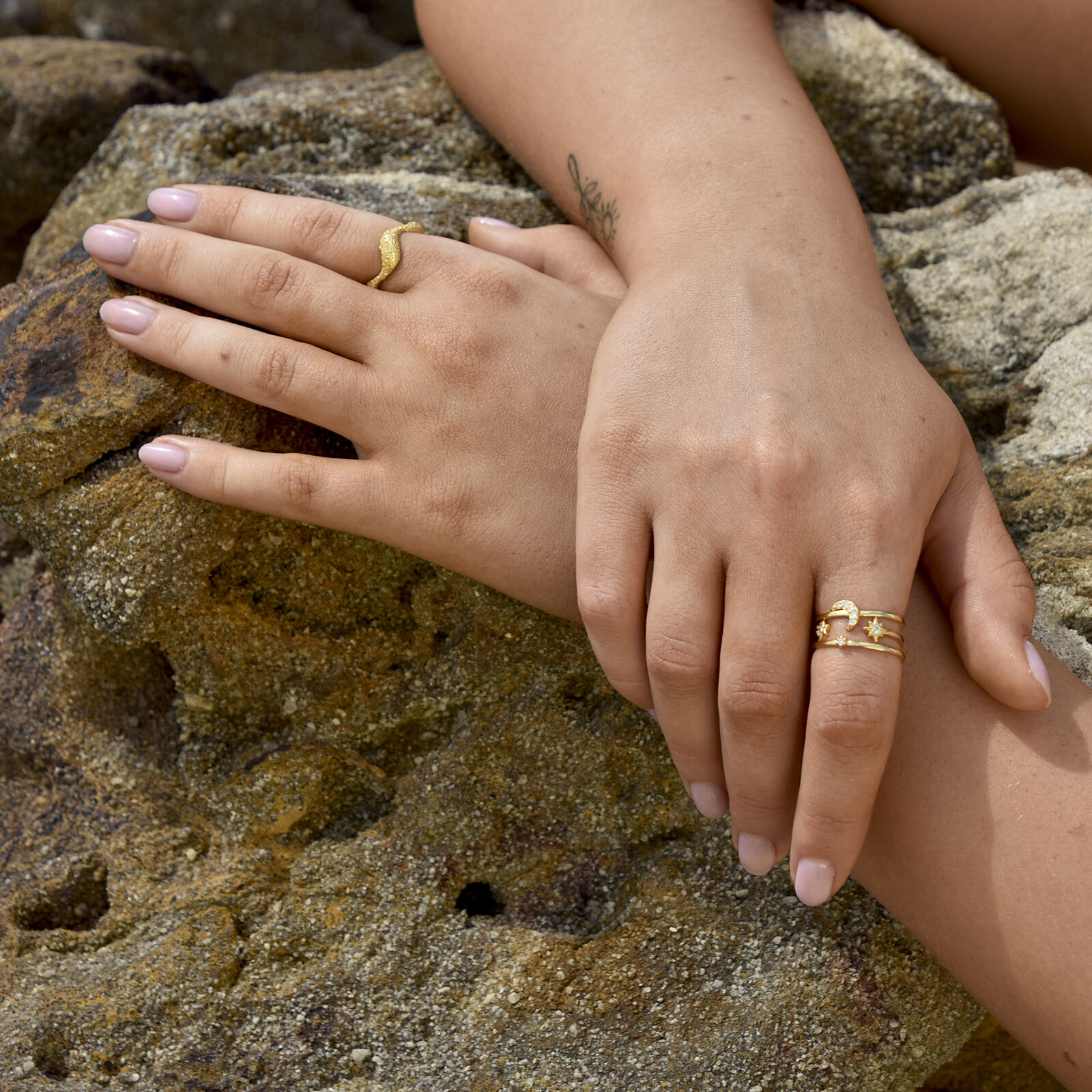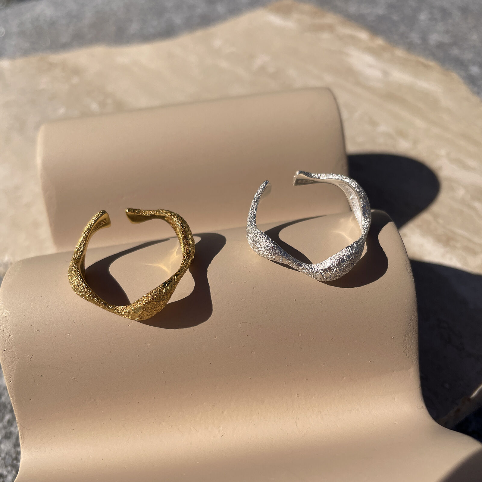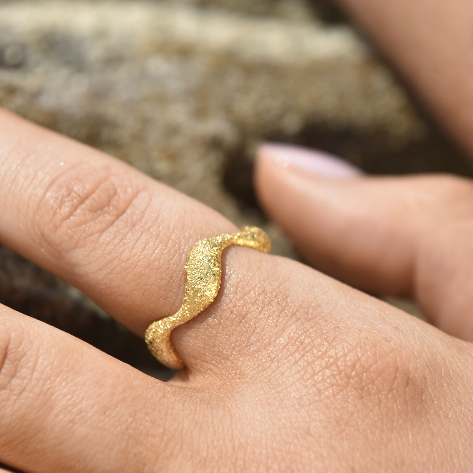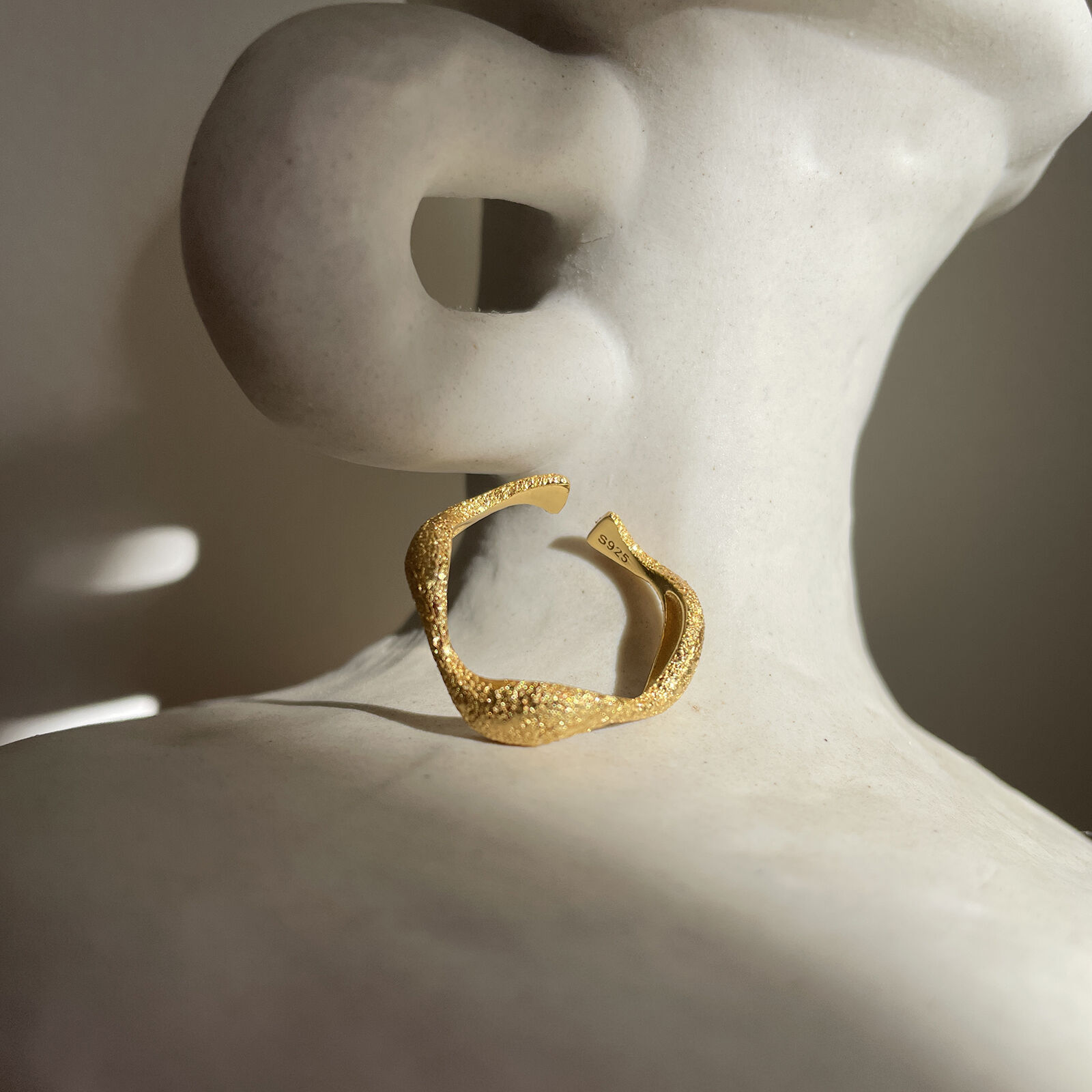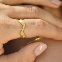 Leave lots of sparkles wherever you go (not just a little). Introducing Isaline Textured Wavy Open Ring (Gold) - a chic and elevated finger beauty to spark up your day. This design features a stippled texture wavy ring band that can be resized for preferred personal fit. This ring is made in solid sterling silver with 18ct gold plating for hypoallergenic and enduring wear. A trendy yet unique highlight on its own or mix and match with other rings to create your signature details. Suitable for modern, contemporary, chic, smart casual, casual, ring layering, everyday style and more. Hypoallergenic, nickel, lead, and cadmium free. Available in 18ct gold or silver.