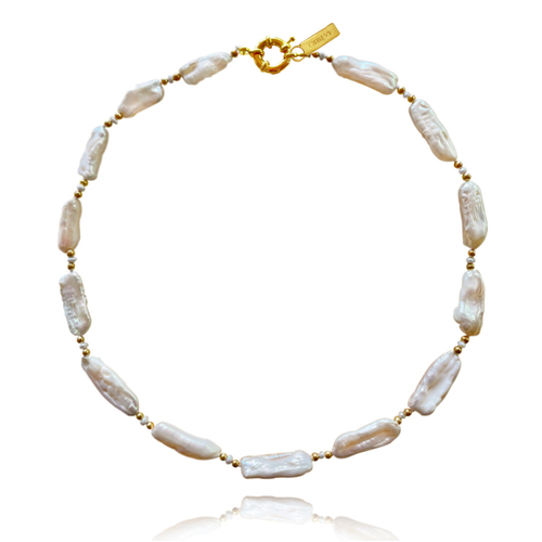 Always appropriate and classy, introducing Isis Baroque Pearl Necklace - ethically handmade pearl beauty for your timeless up-styling. This design features hand-picked natural long baroque pearls threaded along with 18K gold beads. The clasp is crafted in environmentally friendly brass with premium 18K yellow gold plating, giving it a smooth and luxurious gold shine with tarnish resistant. Perfect for modern, chic, coastal, formal, semi-formal, dressy, smart casual styles and more.