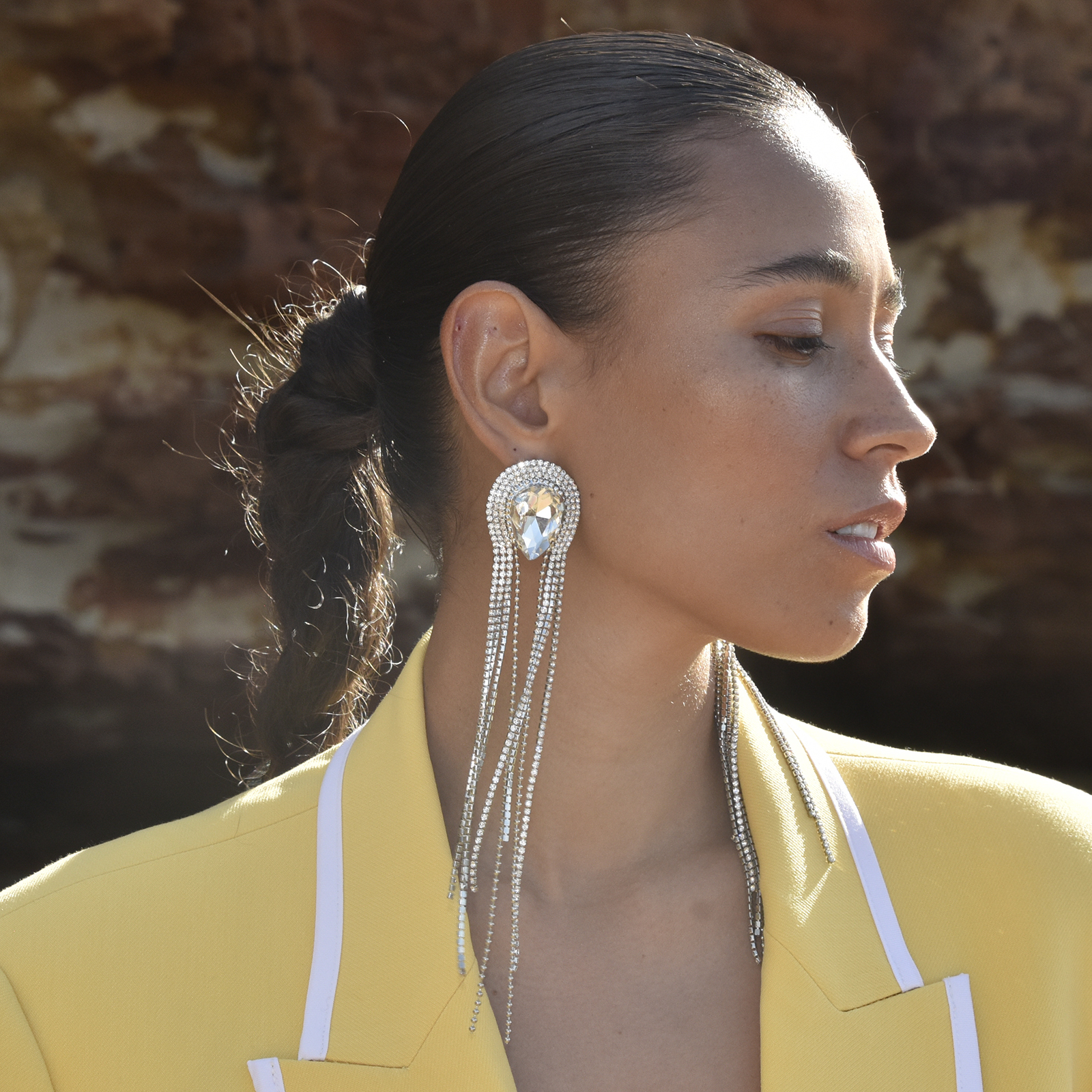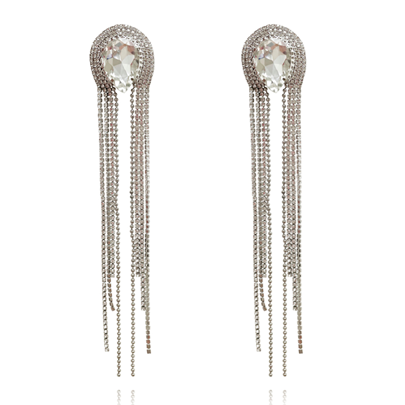 Earrings are an open statement of fashion, and drama is welcomed. Introducing Isolde Diamante Tassel Drop Earrings - an oversized ear beauty for statement-loving fashionistas. This design features upside down teardrop rhinestones embellished with an archway of cascading diamante tassels, giving off dangles of sparkles. The earrings are made in environmentally friendly brass with silver plating. Perfect for formal, semi-formal, glamour, dressy, smart casual styles and more.