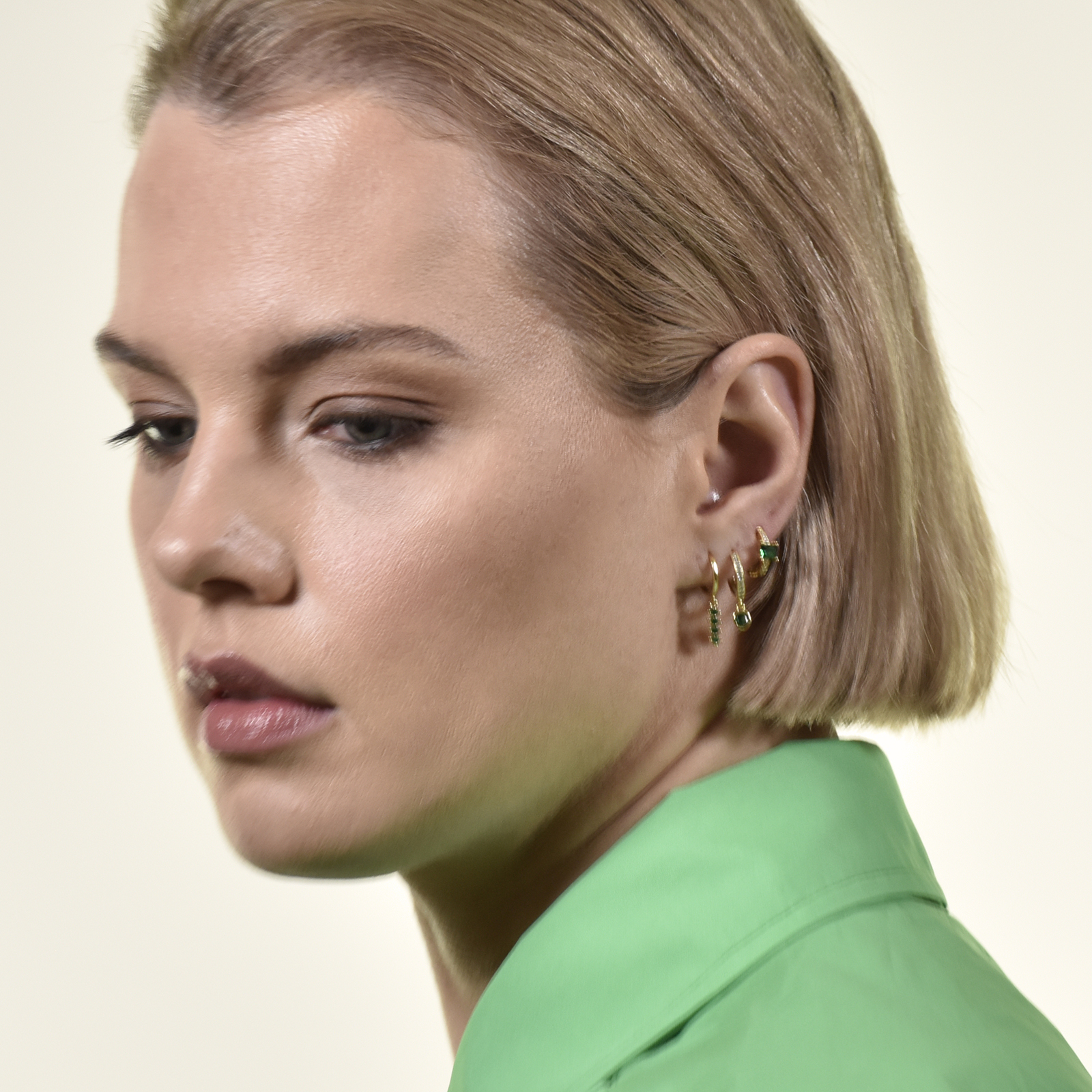Green is the gaze of loveliness. Introducing Jadie Dainty Zircon Drop Earrings (Emerald Green) - a simple and chic bright pop for your effortless everyday styling. This design features Austrian green zircon drops encased in gold, attached to dainty gold hoops, with the front half the hoops embellished with clear Austrian cubic zirconias. The earrings are made in solid sterling silver with 18K gold plating for hypoallergenic and enduring wear. Perfect for modern, chic, minimalist, punk, earring layering, smart casual, casual, everyday styles and more. Hypoallergenic, nickel, lead, and cadmium free.