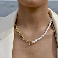 Pearl elegance with a modern era and strength. Introducing Jana Pearl Chain Toggle Bar Necklace - an on-trend pearl chain neckpiece for modern day muses. This deign features a half freshwater pearl necklace and a half cuban chain necklace with a toggle closure in the middle. The chain necklace is made of environmentally friendly brass with 18k gold plating. The pearls are natural freshwater pearls. When wearing, you can place the toggle closure at the front or at the back, depending on personal preference. A unique, trendy, and lighthearted piece for modern, chic, artsy, coastal, punk, smart casual, and casual styles. Hypoallergenic, nickel, cadmium and lead free.