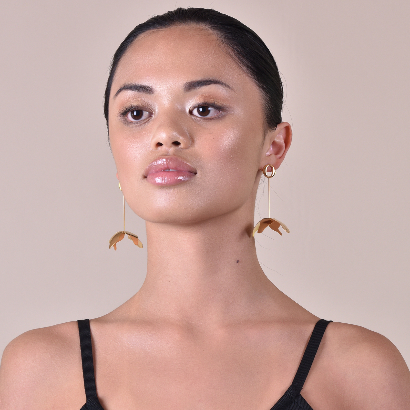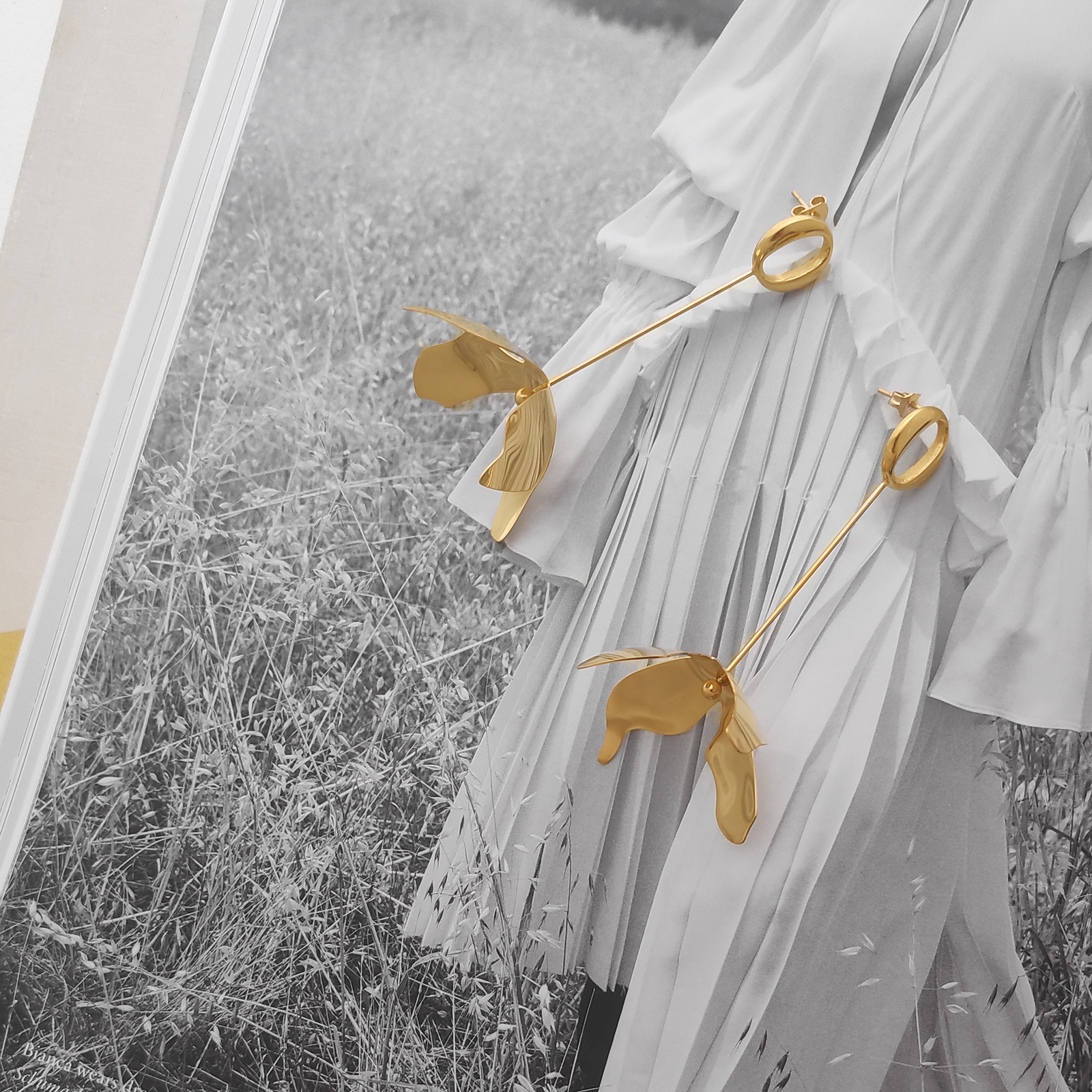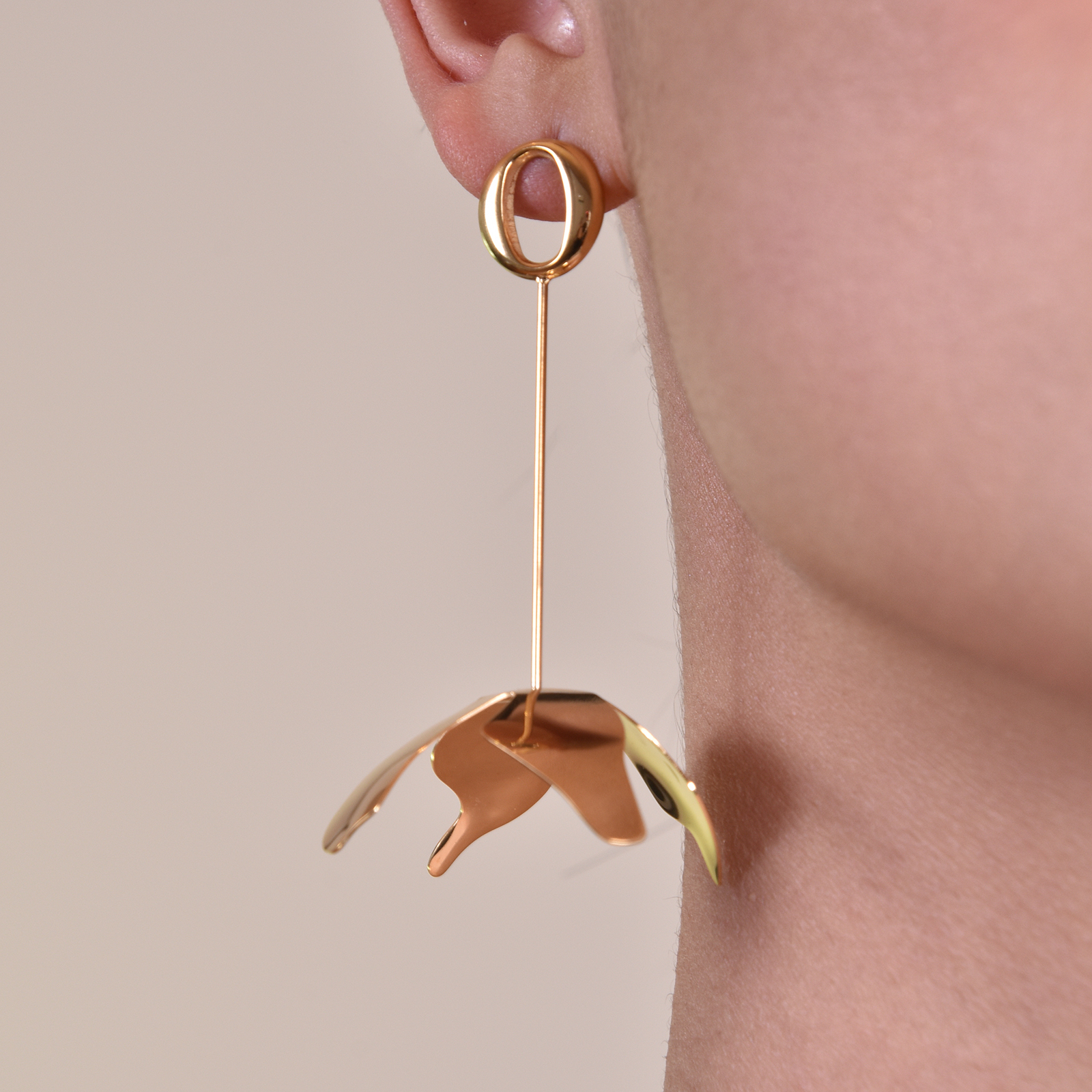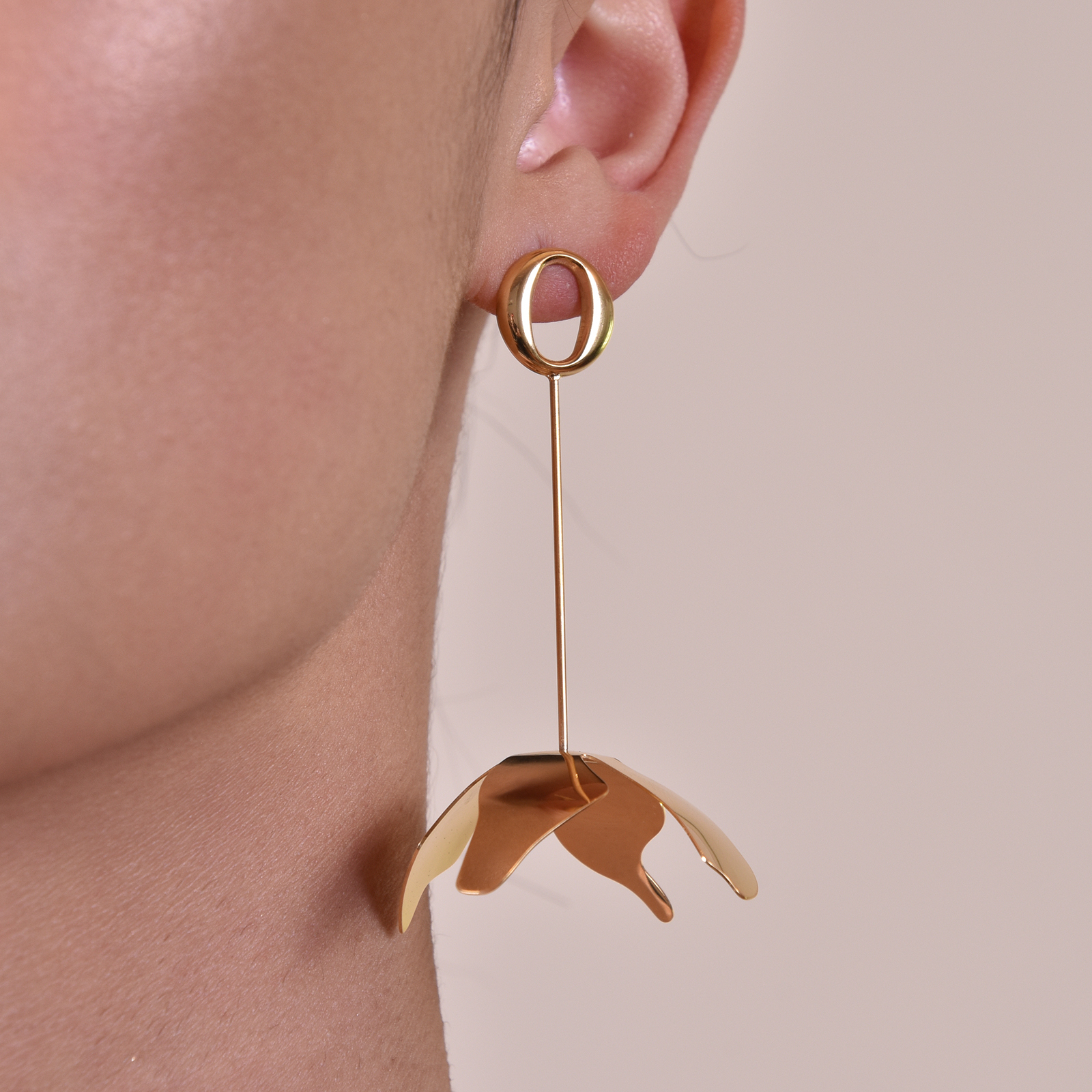 Modern floral style with an artsy edge. Introducing Jeane Sculpture Petal Drop Earrings - a floral design inspired by modern sculpture. The earrings are crafted in titanium steel with 18K gold plating and a smooth polished finish. This elegant and unique design is perfect for artsy, modern, creative, chic, dressy, formal, semi-formal, smart casual styles and more. Hypoallergenic, nickel, cadimum and lead free. Available for both pierced and non-pierced ears.