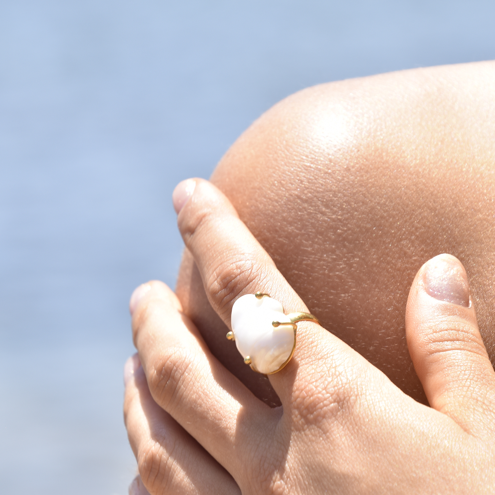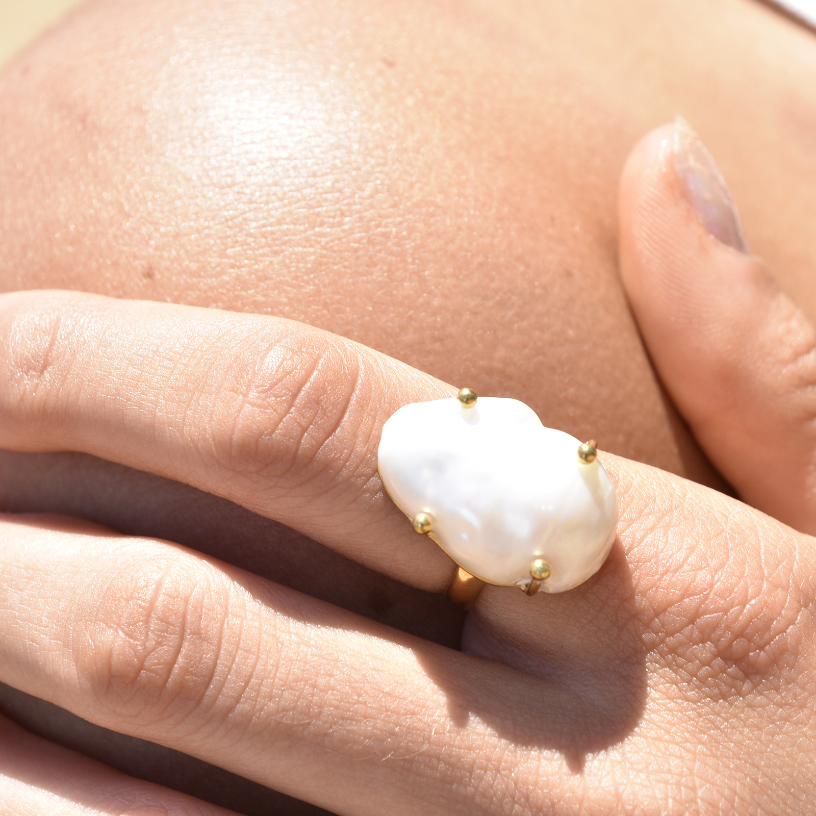 Timeless light luxury pearl beauty handmade with love. Introducing Jaquetta 24K Baroque Pearl Open Ring - an artisan crafted finger beauty with a stunning pearl highlight. This design features a custom cut (flat backed) natural baroque pearl embedded in a claw setting attached to a classic ring open ring band. The pearl used in this piece is a handpicked premium quality natural baroque pearl with smooth surface and a high lustre. The ring is crafted in solid sterling silver with 2.5 microns of high quality 24k gold plating, forming a thick gold bond to the metal. It is also smoothly polished to a gorgeous high shine that endures. Due to the softness of solid sterling silver, this ring can be easily adjusted manually for the best fit. A romantic, feminine, and classy pearl beauty for those who appreciate quality and style. Perfect for modern, retro, luxury, bridal, wedding, coastal, high fashion, dressy, smart casual, casual, everyday styles and more. Hypoallergenic, nickel, cadmium and lead free.