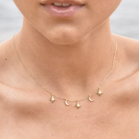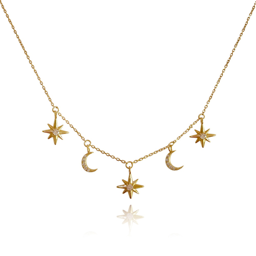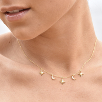 Feminine, chic, and delicate. Introducing Jayla Celestial Beauty Necklace (Gold) - a fine style neckpiece with celestial adornments. This design features 3 starburst and 2 moon crescent pendants adorned with Austrian zirconias - evenly spaced around the bottom of the necklace. The necklace and pendants are made of sterling silver with 18K gold plating. The necklace is 39.5cm long including a 10cm adjustable link, allowing it be worn as a choker as well. Perfect for modern, retro, chic, fine, necklace layering, boho, smart casual, casual, everyday styles and more. Suitable for teens. Hypoallergenic, nickel, cadmium and lead free.