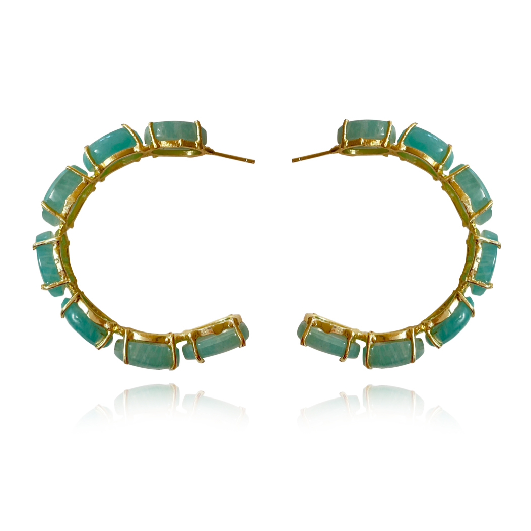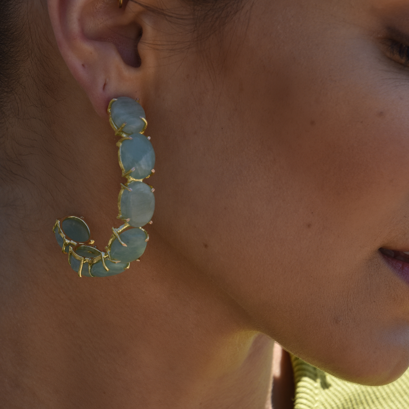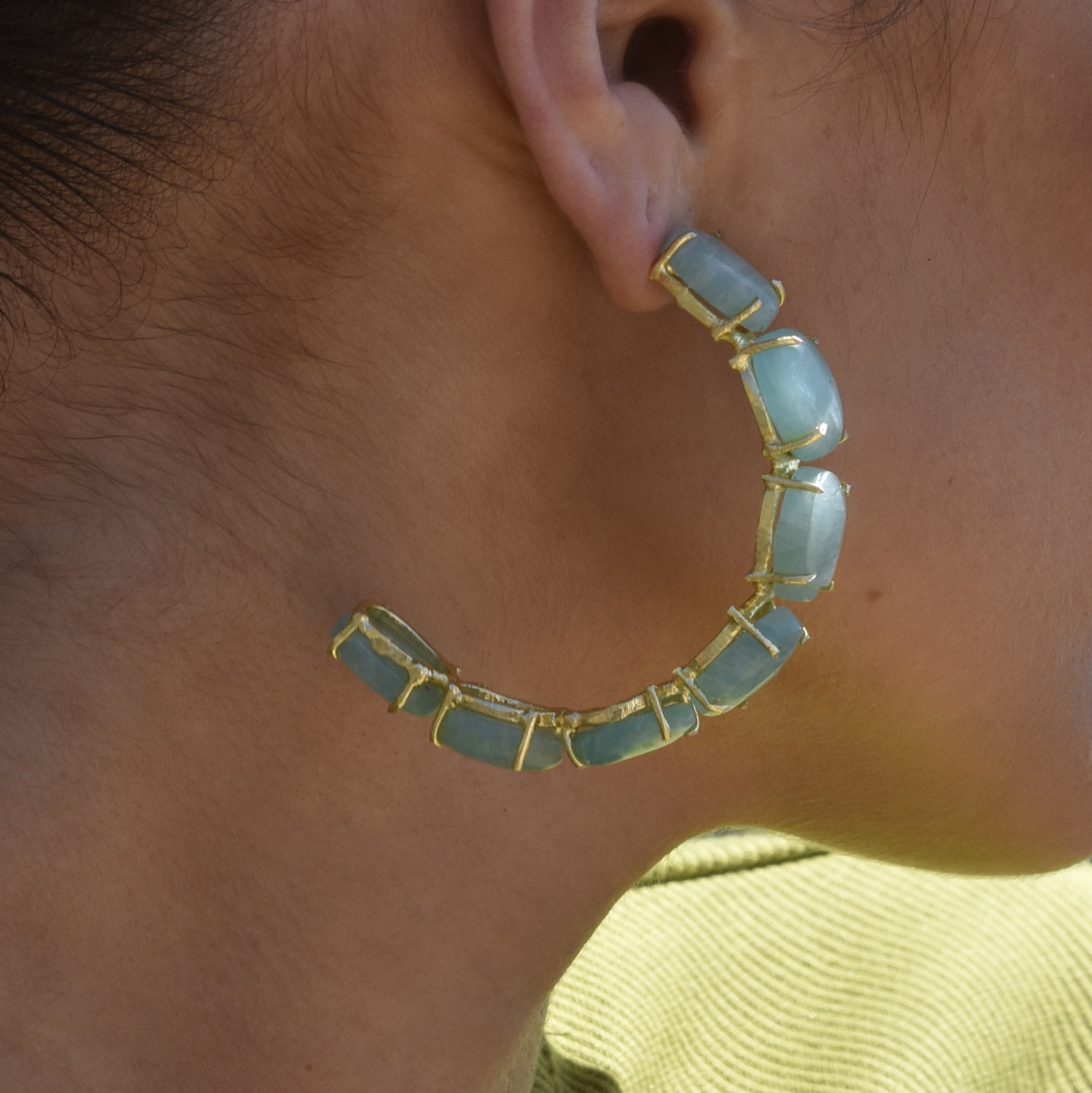 Outspoken statement adorned with natural chalcedony gemstones. Introducing Jemila Chalcedony Gemstone Hoop Earrings - an artisan handmade C hoop style ear love for lovers of handmade jewellery and gemstones. This design features tumble-polished natural green chalcedony stones embedded in a C hoop frame via claw settings. The earrings are made of environmentally friendly brass with 18K gold plating. Chalcedony is a crystalline variant of silica that comprises fine particles of moganite and quartz. You may notice subtle colour change under different lighting. Perfect for modern, retro, dressy, boho, smart casual, casual styles and more. Hypoallergenic, nickel, cadmium and lead free.