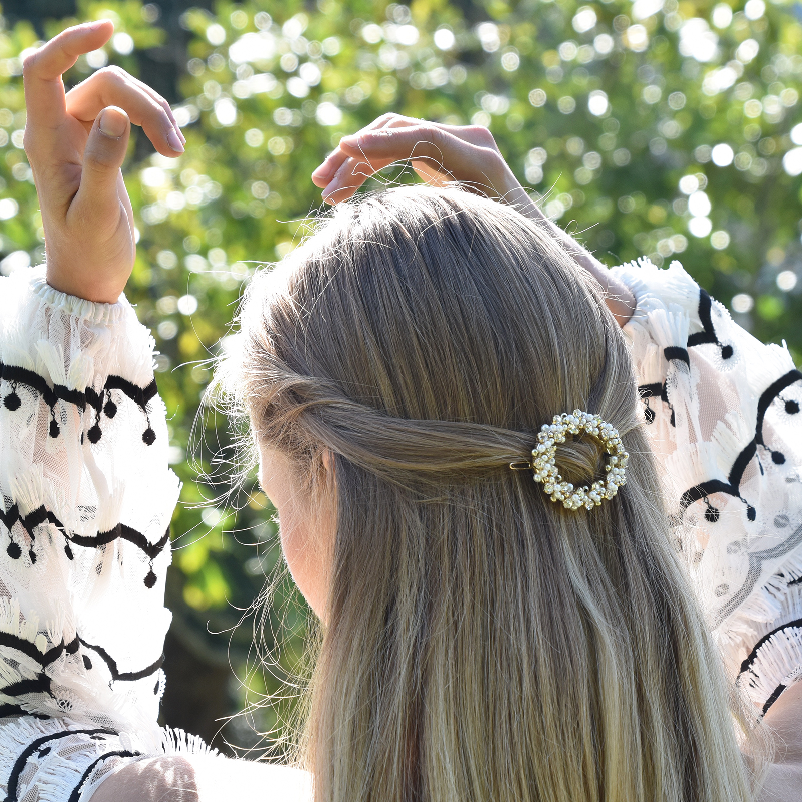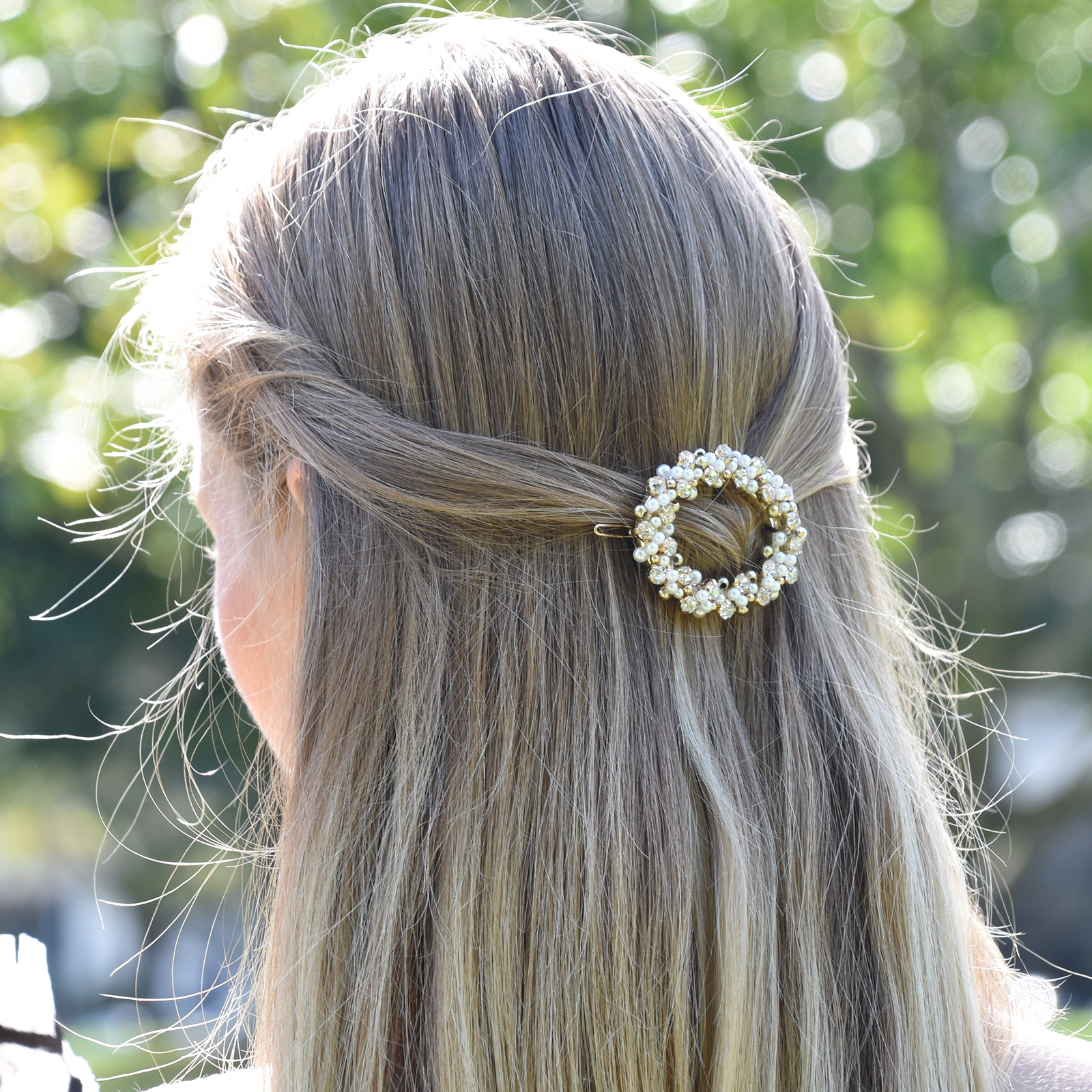 A pretty hair statement with some sparkles. Introducing Jillian Vintage Barrette – a gorgeous vintage style barrette for those who love to accessorise. The piece is crafted with simulated pearls and decorative crystal stones affixed on a gold oval metal clip – making a highlight on your hair. Perfect for modern, vintage, chic, girly, casual styles and more. Suitable for kids and teens.