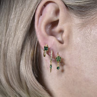 Green is the gaze of loveliness. Introducing Jovie Dainty Zircon Spike Drop Earrings (Emerald Green) - a simple and chic bright pop for your effortless everyday styling. This design features Austrian green zircons encased in spike-shaped drops, attached to dainty gold hoops. The front half the gold hoops are embellished with clear Austrian cubic zirconias. The earrings are made in solid sterling silver with 18K gold plating for hypoallergenic and enduring wear. Perfect for modern, chic, minimalist, punk, earring layering, smart casual, casual, everyday styles and more. Hypoallergenic, nickel, lead, and cadmium free.