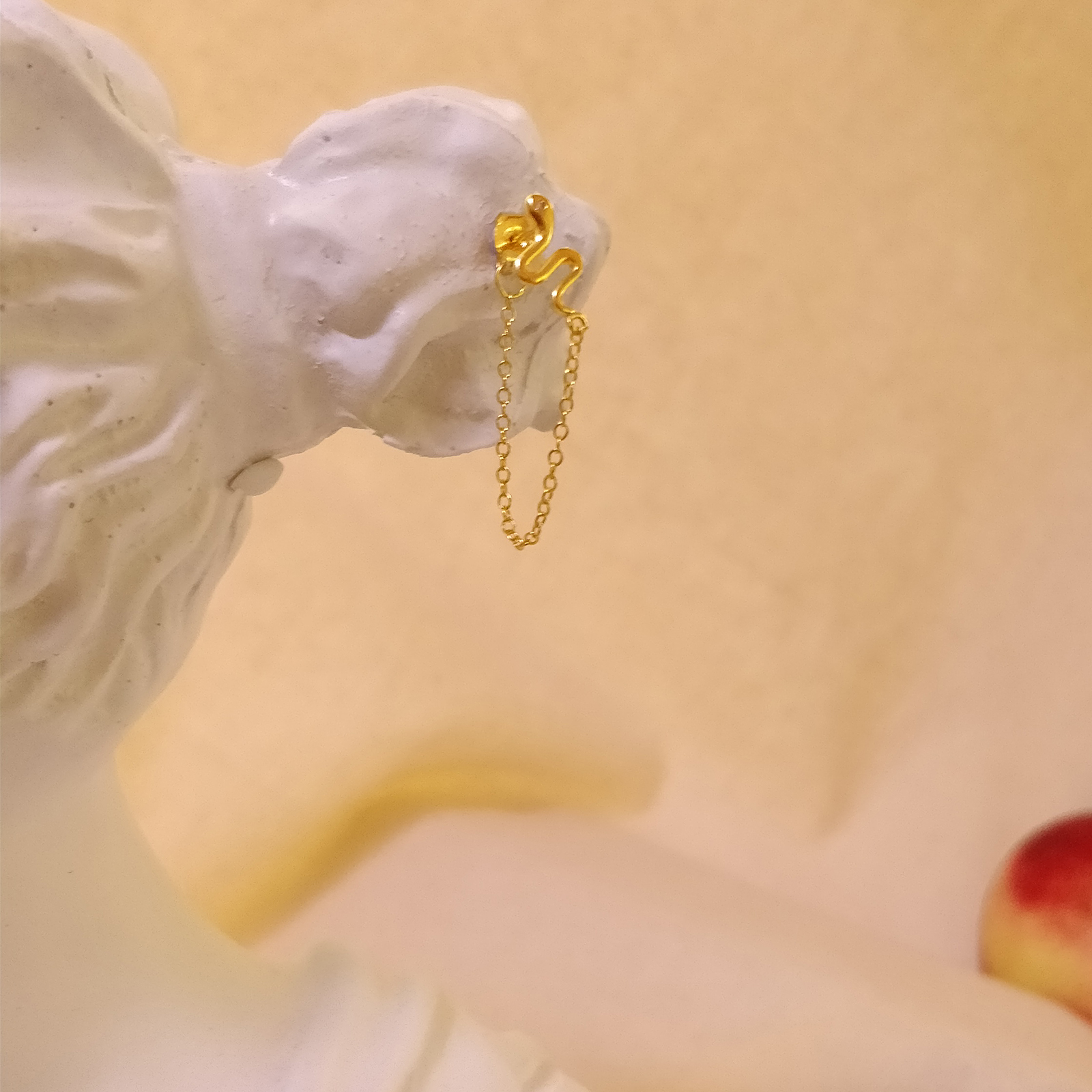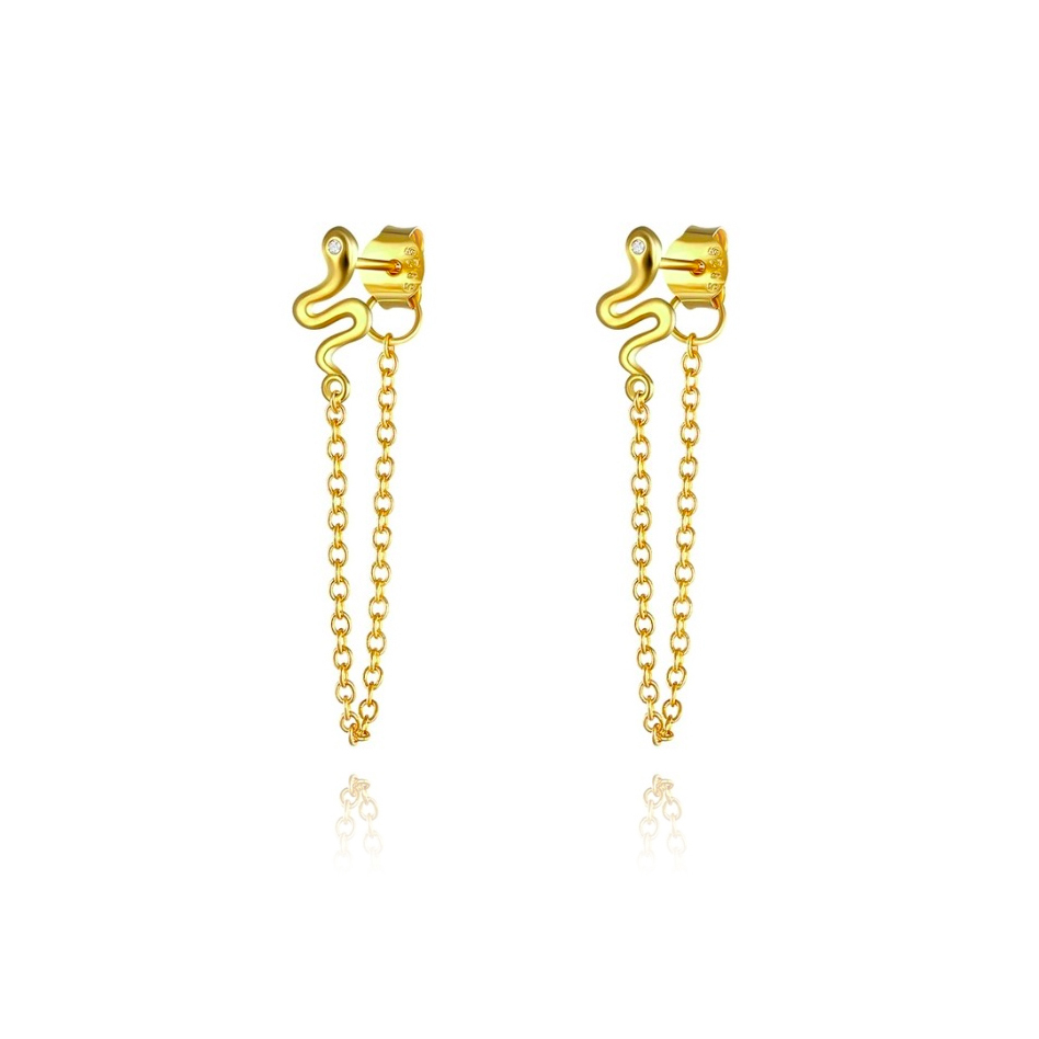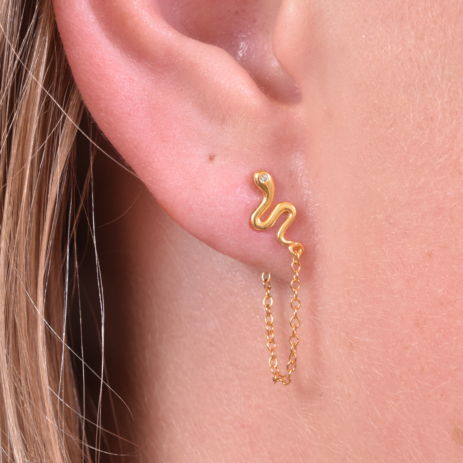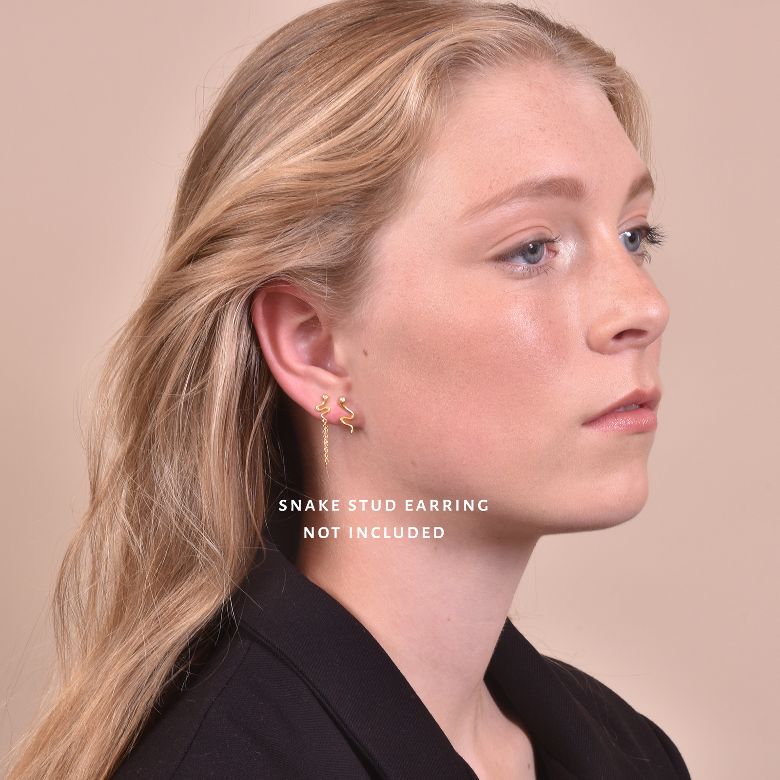 Delicate, detailed and 'attitude-rich', introducing Kalea Gold Filled Snake Chain Earrings - an on-trendy snake style that brings a fuller styling dimension to your ears. Sensitive ears? Not a problem. This design is crafted in sterling silver with 18K gold filled to ensure comfortable wear and long-lasting yellow gold shine. Super versatile and fun, this style is perfect for mismatching or multiple earring wearing with other dainty pieces. Wear outside the box! Sold as pairs.