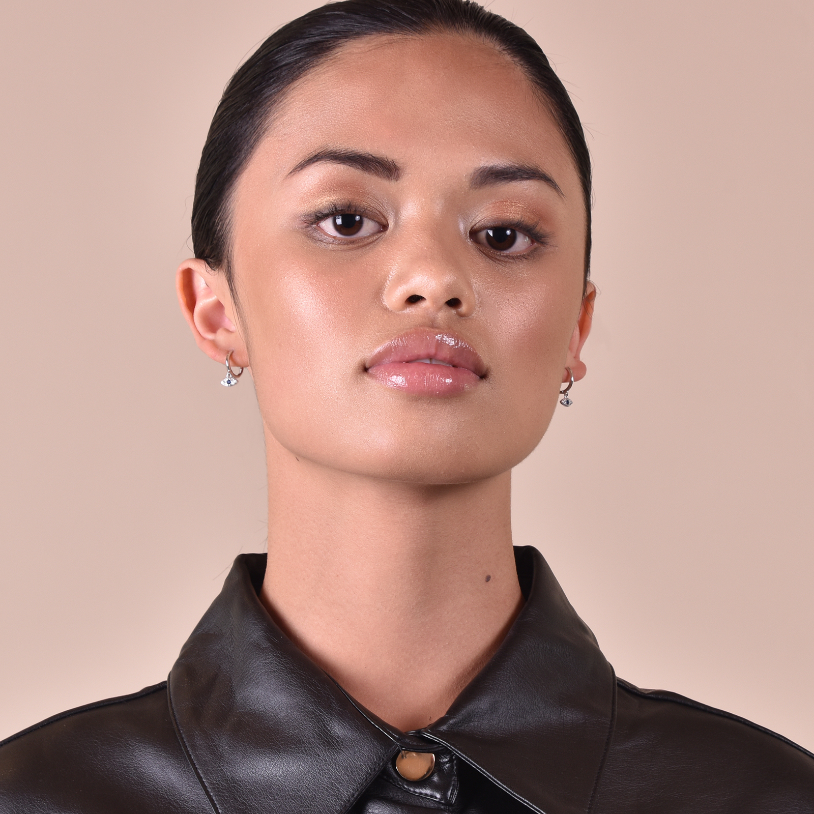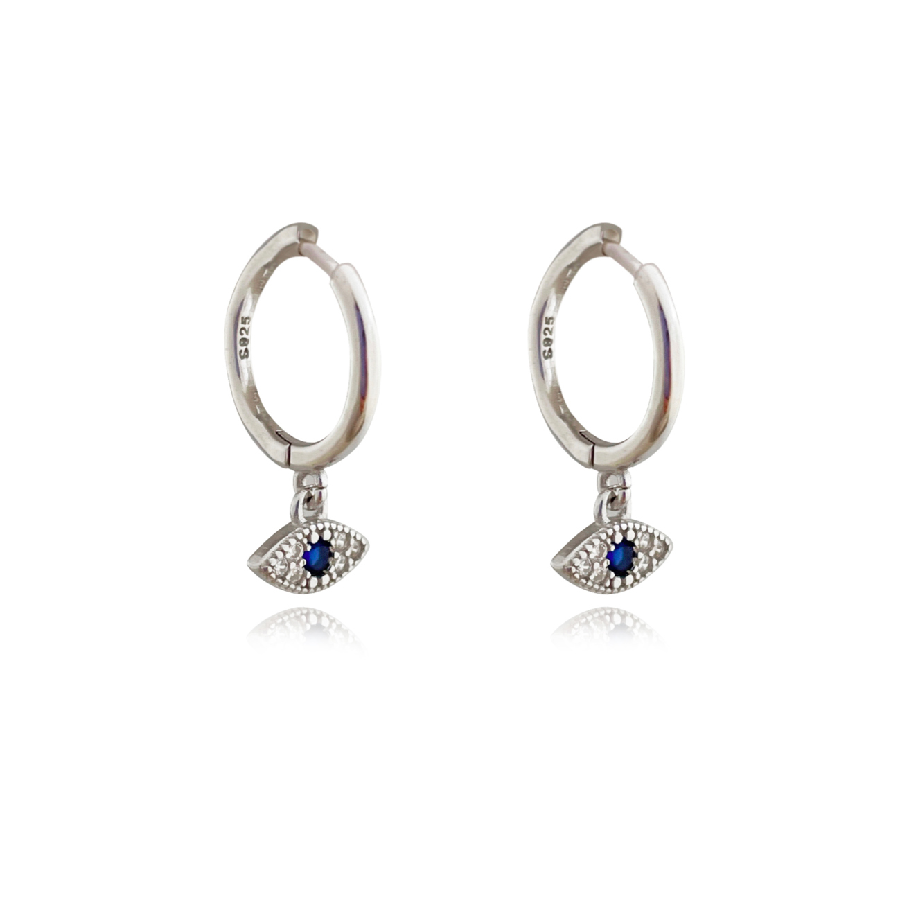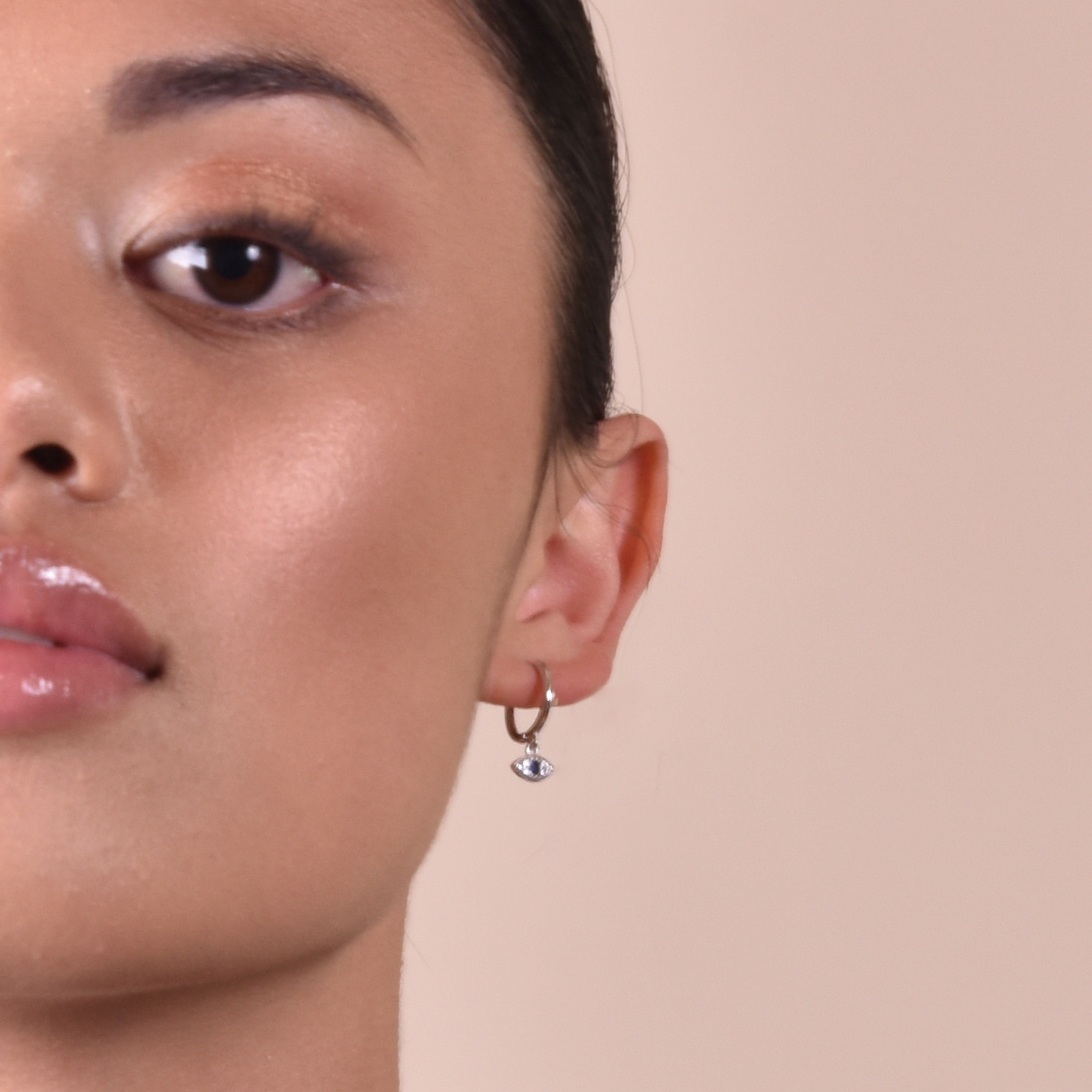 Delicate, chic, and versatile for styling. Introducing Katia Dainty Evil Eye Drop Earrings (Silver) - a classic evil eye style ear love for women and girls of all ages. This design features cubic zirconia embellished evil eye drops attached to silver hoops. The earrings are made of solid sterling silver for hypoallergenic wear. Perfect for day-to-day wear. Suitable for all age groups. Hypoallergenic, nickel, cadmium and lead free.