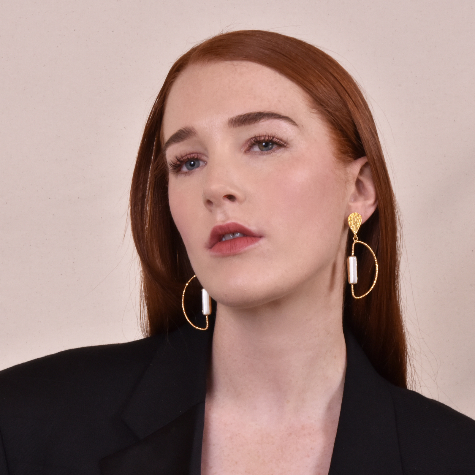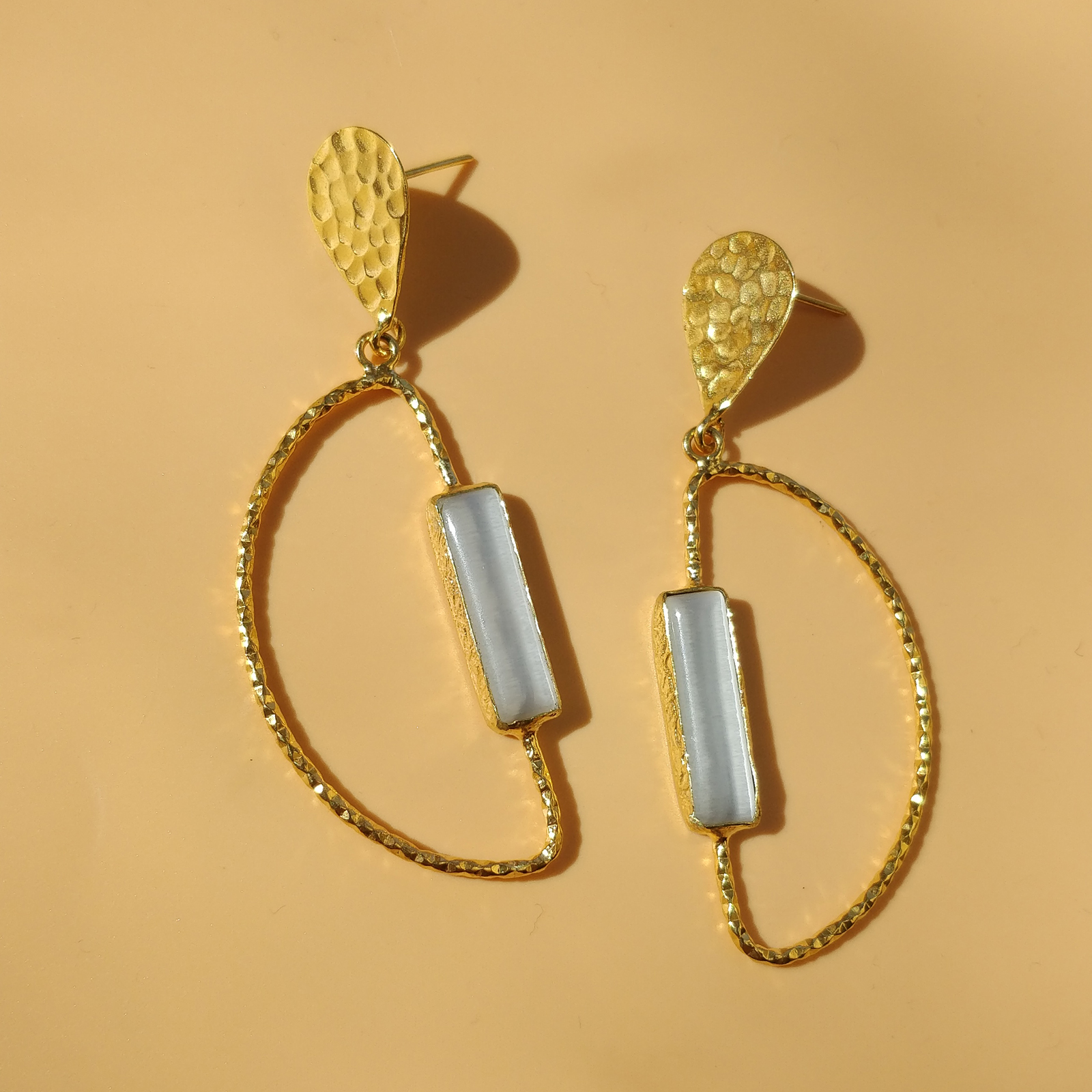 Designed and handmade in our studio using environmentally friendly brass (nickel free) with 24k gold plating, Kloe 24K Cats Eye Stone Earrings blend the element of fine gold and natural cats eye stones in a perfect portion. You will find the medium sized dangles delicate and light, which make this pair a comfortable delight to wear. Perfect for dressy, boho, chic, runway, creative, formal, semi-formal and more occasions. Hypoallergenic, nickel, cadmium and lead free.