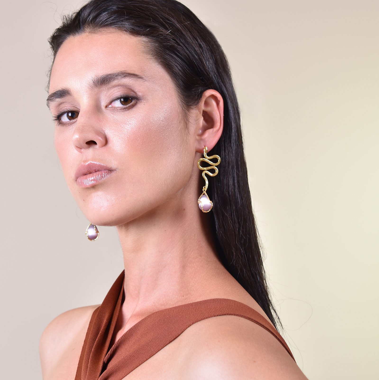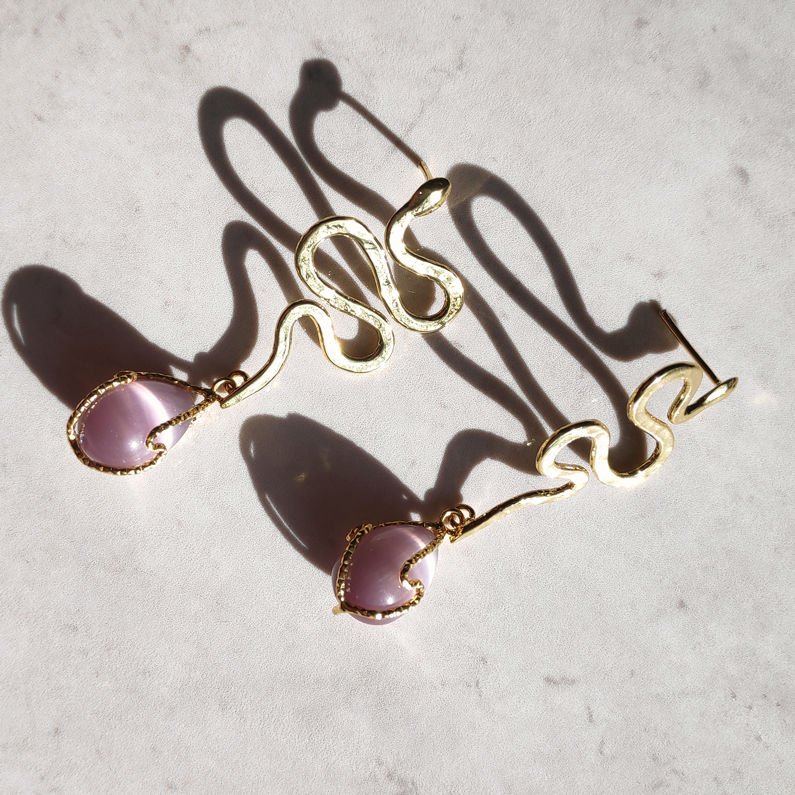 Inspired by ‘The Garden of Eden’ and uniquely crafted with love. Introducing La Déesse Artisan Cats Eye Stone Drop Earrings - an artisan stone drop earring style for a sassy glamour. This design features natural periwinkle toned cats eye stones with a hand-wired gold wrap highlight. The earring metal top is crafted in a serpent shape, made of environmentally friendly brass with 24k pure gold plating. To bring out the 24k gold shine, each piece is hand polished 5 times. Apart from the enchanting natural shine that changes with lighting, wearing cats eyes stone jewellery also has great benefits, such as: