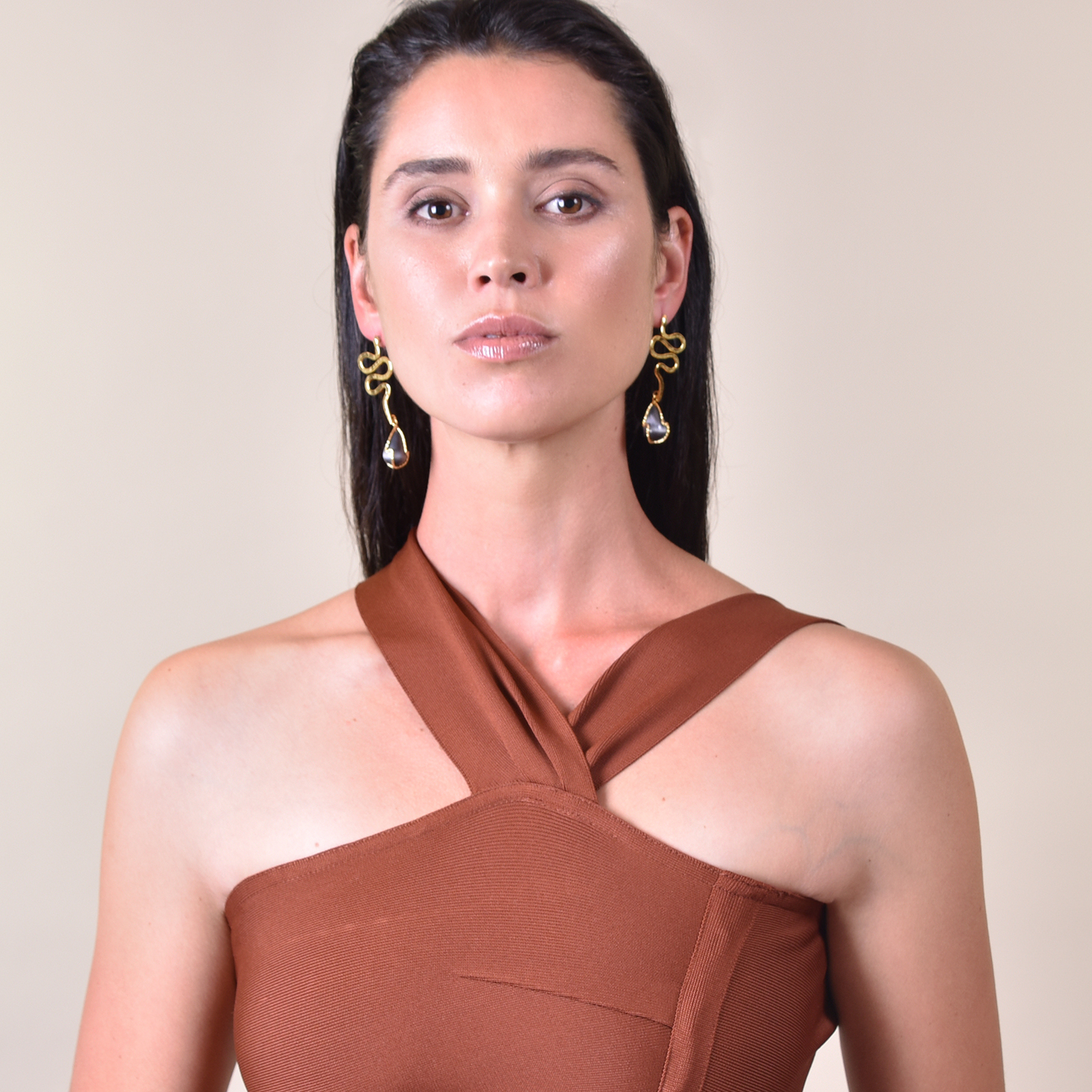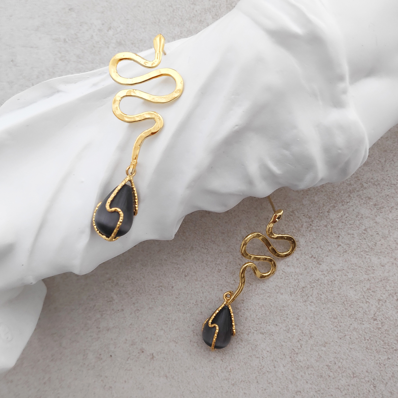 Inspired by ‘The Garden of Eden’ and uniquely crafted with love. Introducing La Muse Artisan Cats Eye Stone Drop Earrings - an artisan stone drop earring style for a sassy glamour. This design features natural smoky toned cats eye stones with a hand-wired gold wrap highlight. The earring metal top is crafted in a serpent shape, made of environmentally friendly brass with 24k pure gold plating. To bring out the 24k gold shine, each piece is hand polished 5 times. Apart from the enchanting natural shine that changes with lighting, wearing cats eyes stone jewellery also has great benefits, such as: