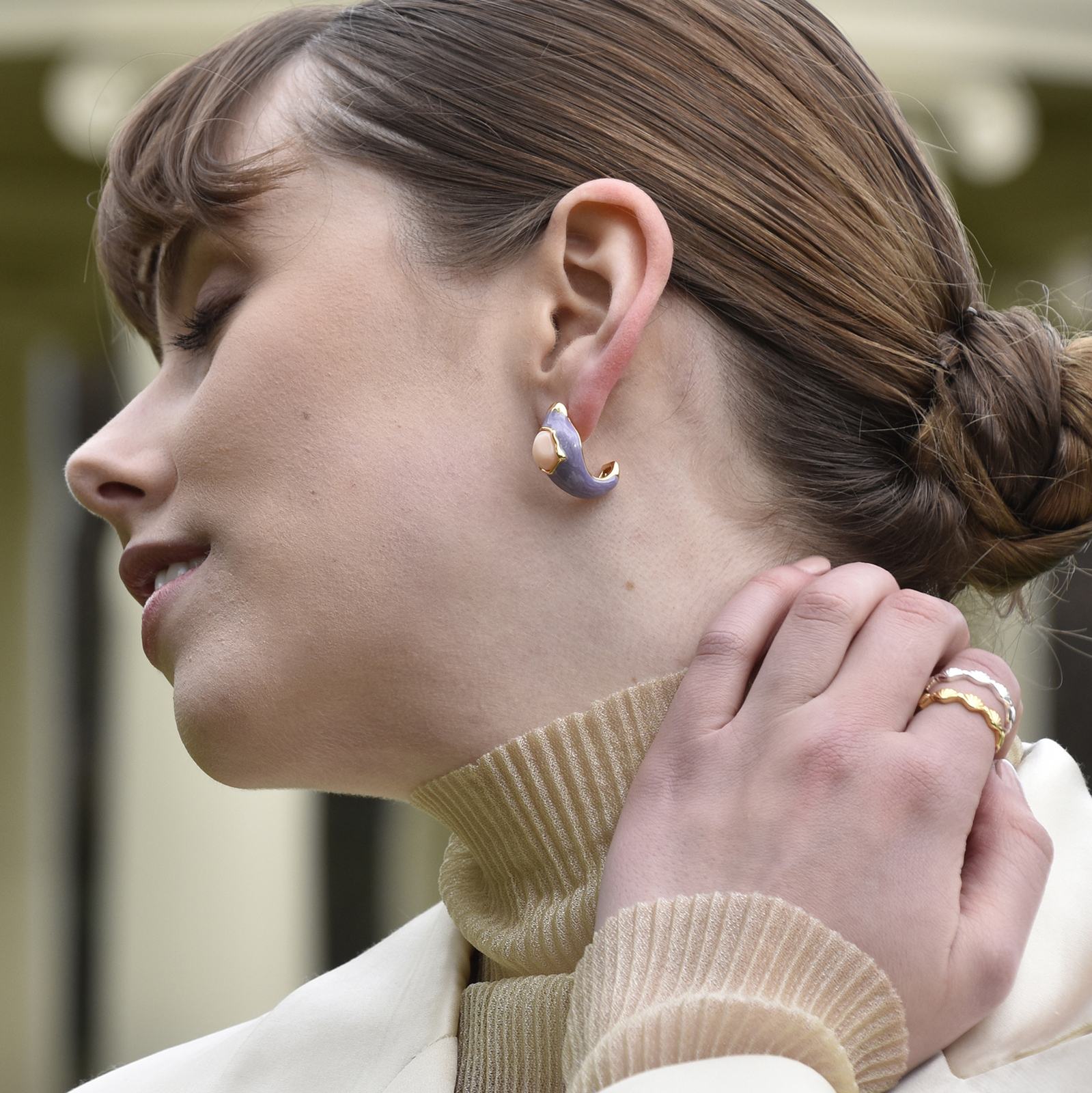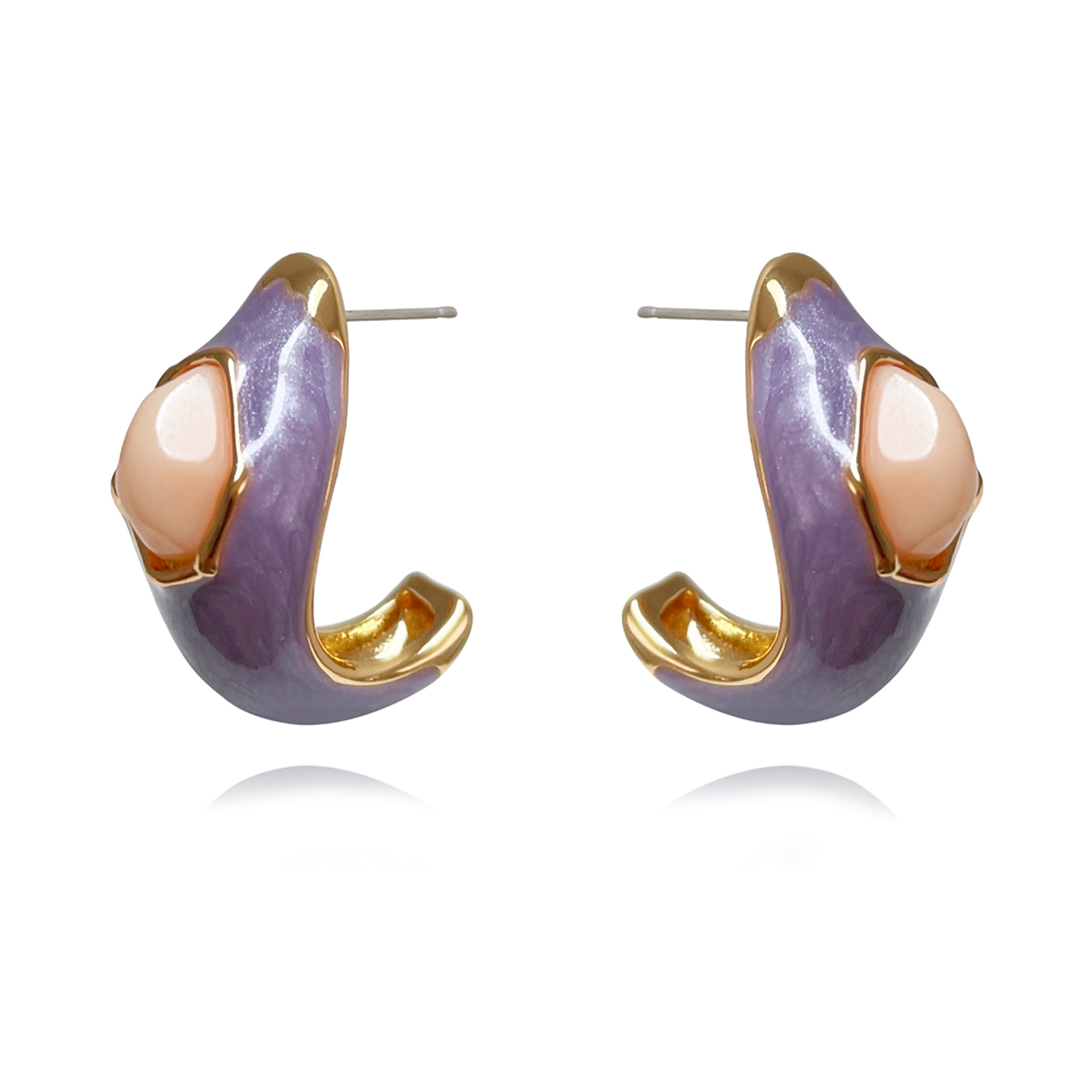 Artsy flamboyant with a trendy chunky C curve. Introducing Lafayette Enamel Croissant C Hoop Earrings (Taro) - an artisan crafted modern C hoop ear love embracing creativity and modern aesthetics. This design features curved chunky C framed earrings with a shimmering lilac enamel surfacing. The earrings are made in environmentally friendly brass with 18K gold plating. The earring posts are made in sterling silver for hypoallergenic wear. A unique and trend-setting ear highlight for style hunters who love something outside the norm and chic. Suitable for contemporary, retro, Parisian, smart casual, casual style and more. Hypoallergenic, nickel, lead, and cadmium free.
