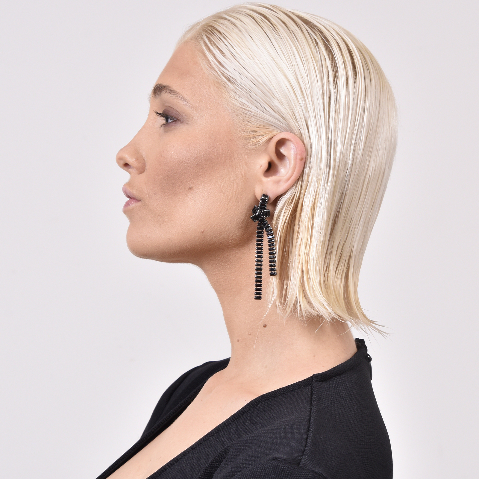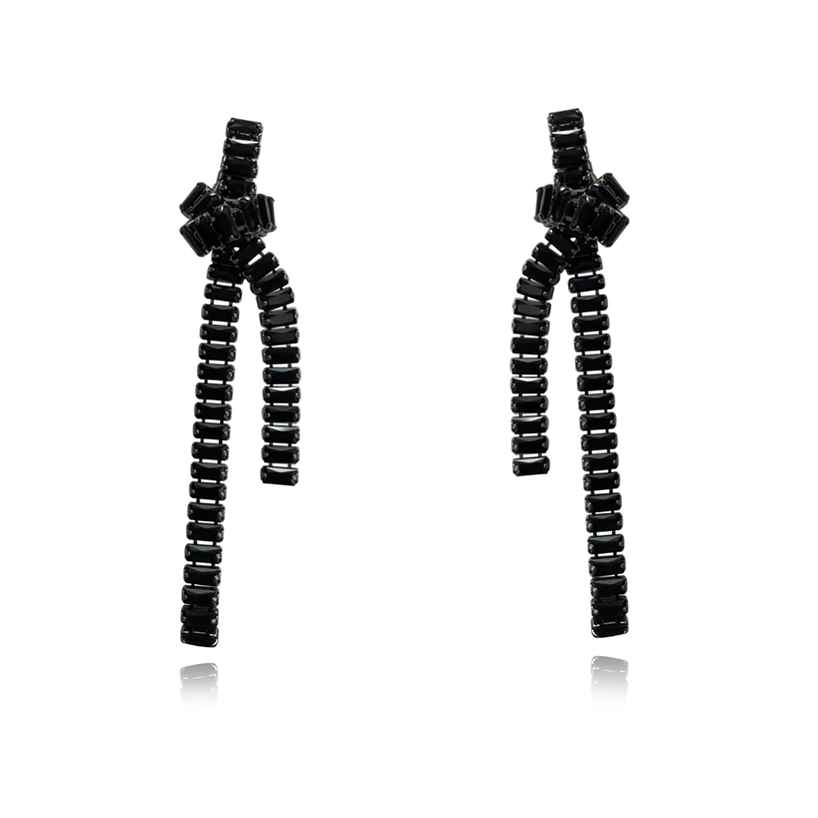 Black is quiet and loud at the same time. Introducing Laila Noir Knot Earrings - a drop that speaks of elegance, modesty, attitude and a sense of playfulness. This design features knotted black rhinestone drops with a ribbon style. The earrings are made in environmentally friendly brass. Suitable for modern, creative, runway, dressy, smart casual, casual styles and more. Hypoallergenic, nickel, lead, and cadmium free.