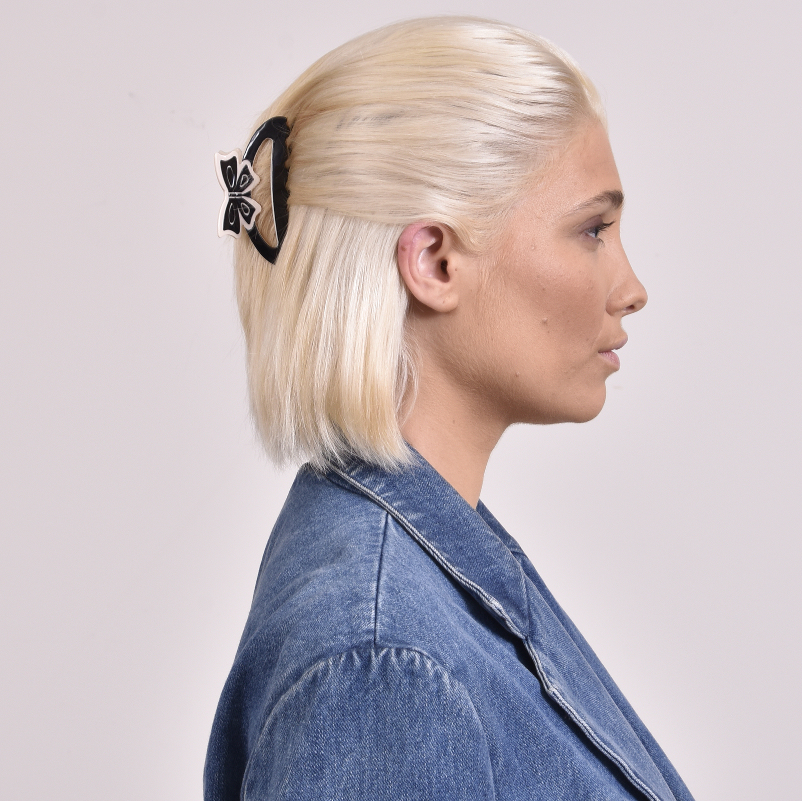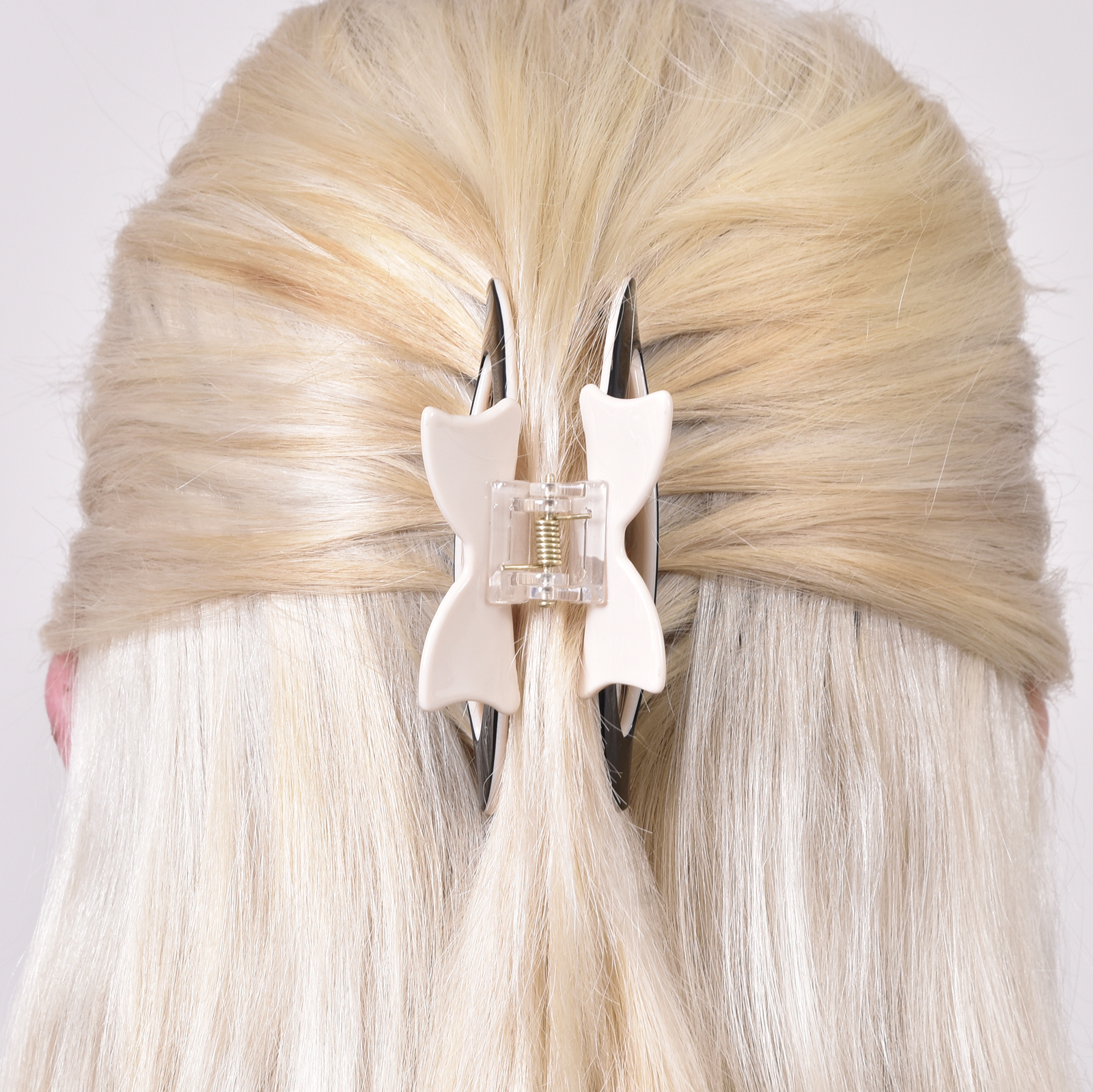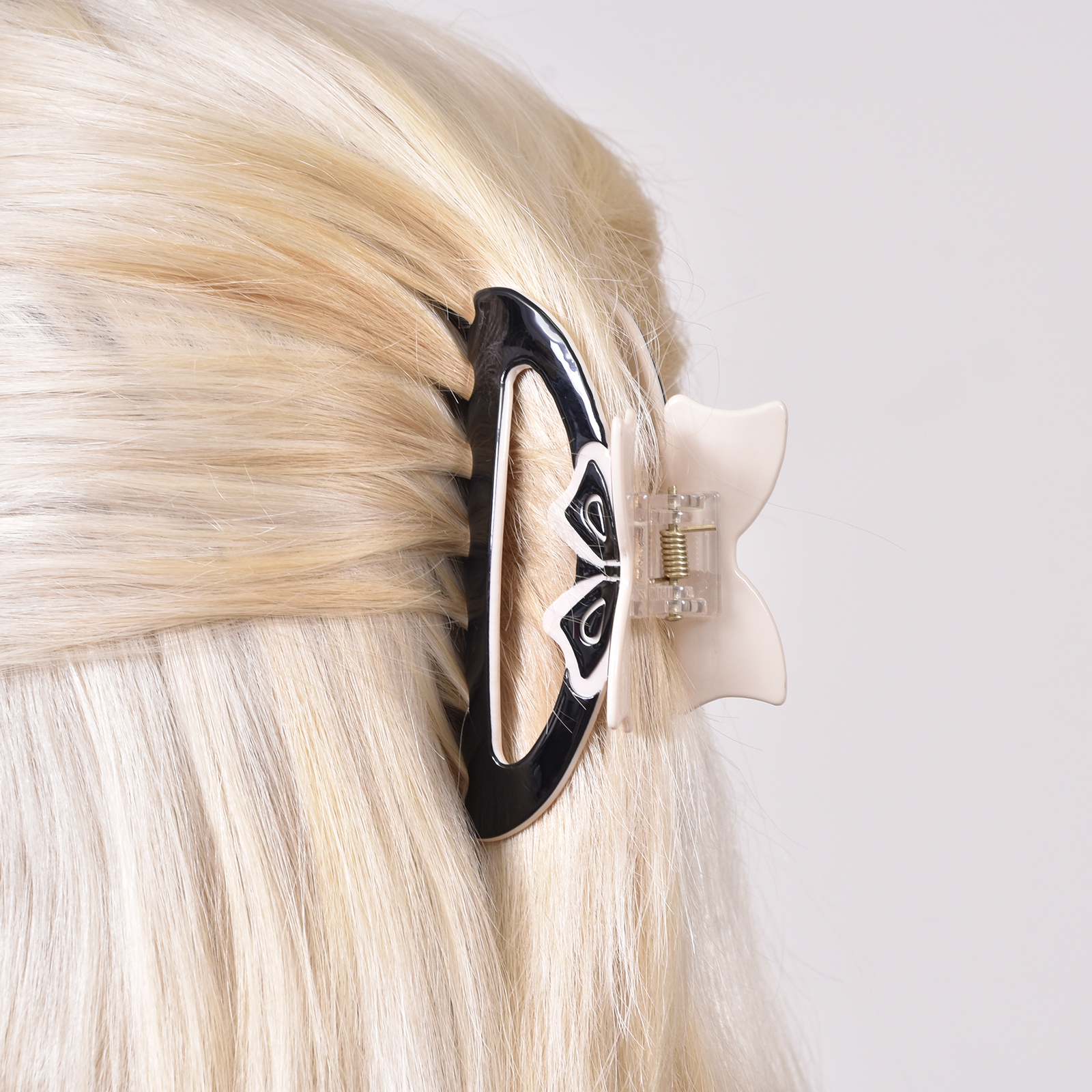Call it the ‘bow chic’. Introducing Lainey Bow Hair Claw - a chic and playful hair cutie for bow lovers. This hair claw is made of acrylic with mixed colours of black and beige. This claw is approximately 85mm in length and features one bow on each side of the claw. It offers a strong grasp of hair. Suitable for modern, retro, chic, feminine, girly, smart casual, casual, and everyday wear.