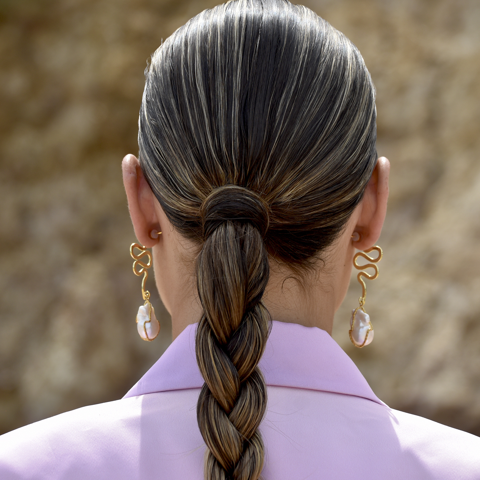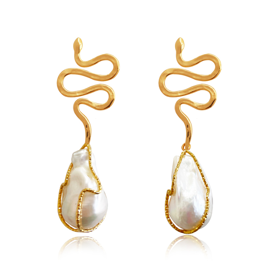 Pearl extravange with a daring elegance and playfulness. Introducing L 'amour 24K Luxury Baroque Pearl Drop Earrings - an artisan crafted luxury pearl beauty for high fashion muses and lovers of uniqueness. This design features hand-picked natural large sized baroque pearls artistically wrapped with textured gold lines. The body of the earrings also features a winding serpent, made of environmentally friendly brass with 24k pure gold plating. An exquisite ear art full of attitude for modern, artsy, creative styling, formal, semi-formal, dressy, fashion events, runway styling, smart casual styles and more. Hypoallergenic, nickel, cadmium and lead free.