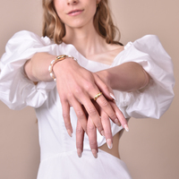 Chic, elegant and versatile for styling. Introducing Lanette Gold Vermeil Twisted Open Ring - a French style croissant open ring with a subtle shimmer. This design features a semi-chunky twisted ring embellished with clear Austrian zircons on the front of the ring. The ring is made of solid sterling silver with 2.5 microns of 18k gold plating, ethically made to last. The inner diameter of this ring by default is 18mm. It can be easily adjusted manually for an ideal fit. A timeless finger beauty for modern, vintage, chic, ring stacking, formal, semi-formal, smart casual, casual, and everyday wear. Hypoallergenic, nickel, cadmium and lead free.