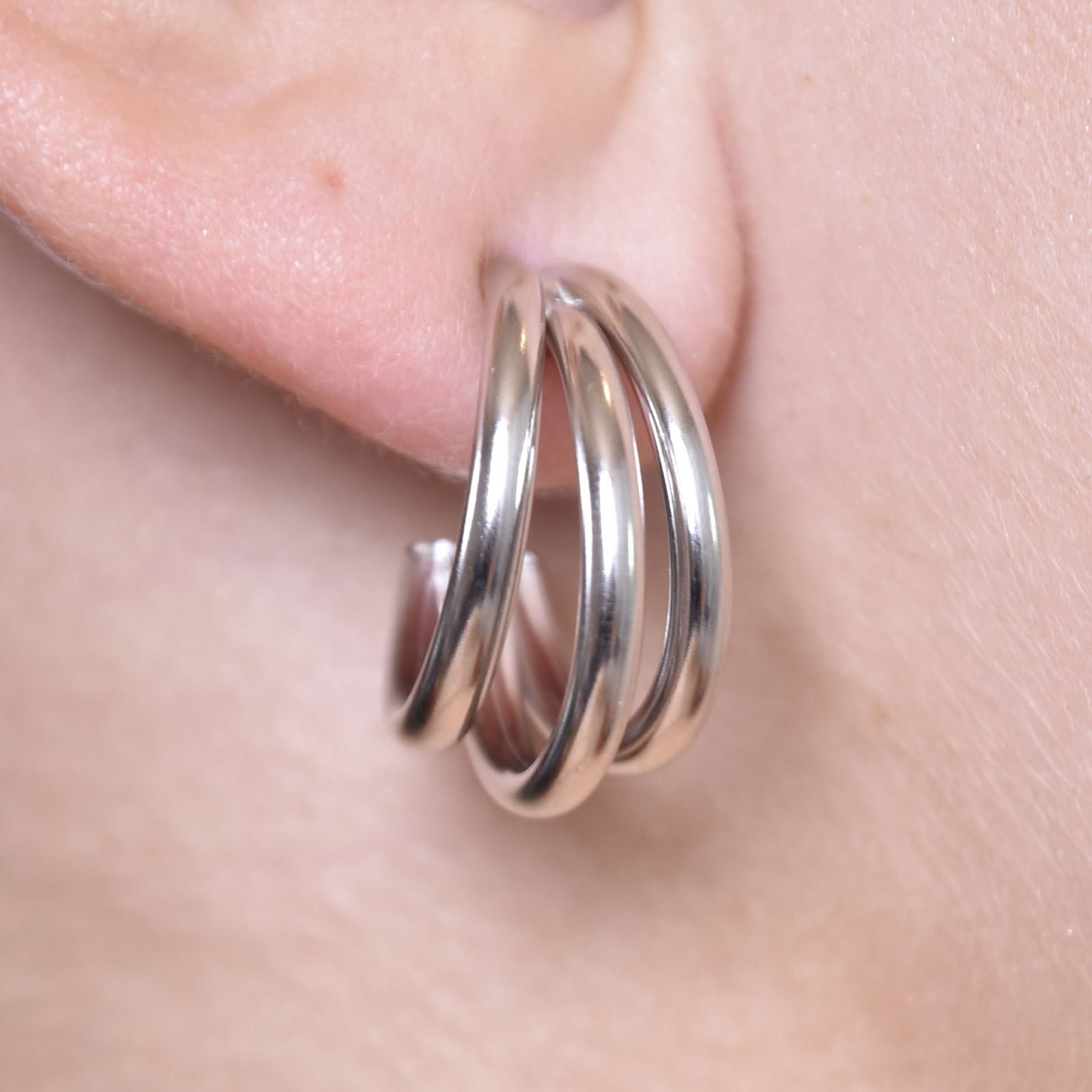 Contemporary, creative and super chic. Introducing Laure Artsy Curved Lining Earrings (Silver) - a modern artsy style ear love with simple and playful lines. This design features curved and joined hoops (3 lines) forming a 3D hug around your earlobe. The earrings are made of solid sterling silver for hypoallergenic and durable wear. They are of a comfortable weight for all day wearing. Perfect for modern, creative, chic, feminine, simple, smart casual, casual styles and more. Hypoallergenic, nickel, cadmium and lead free.