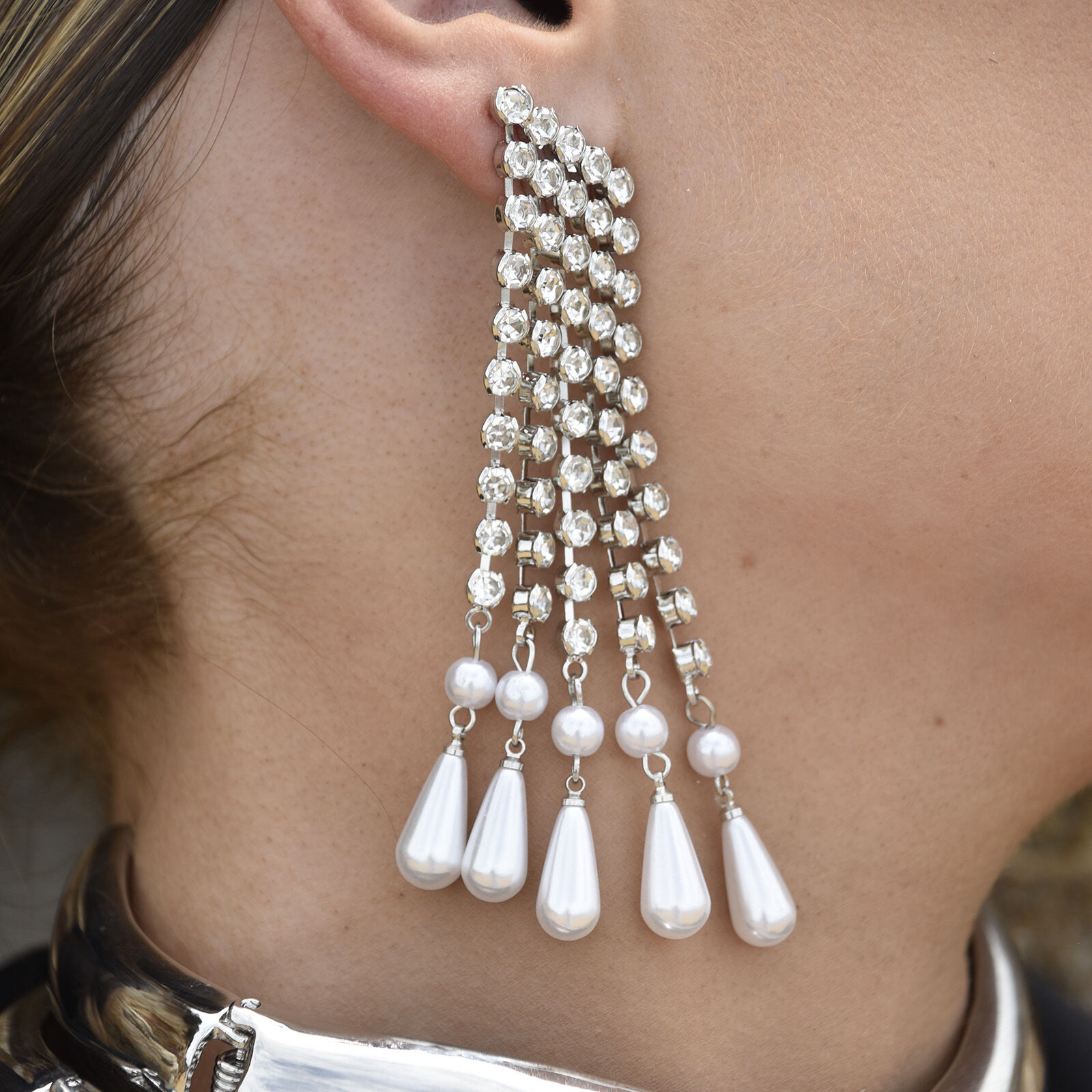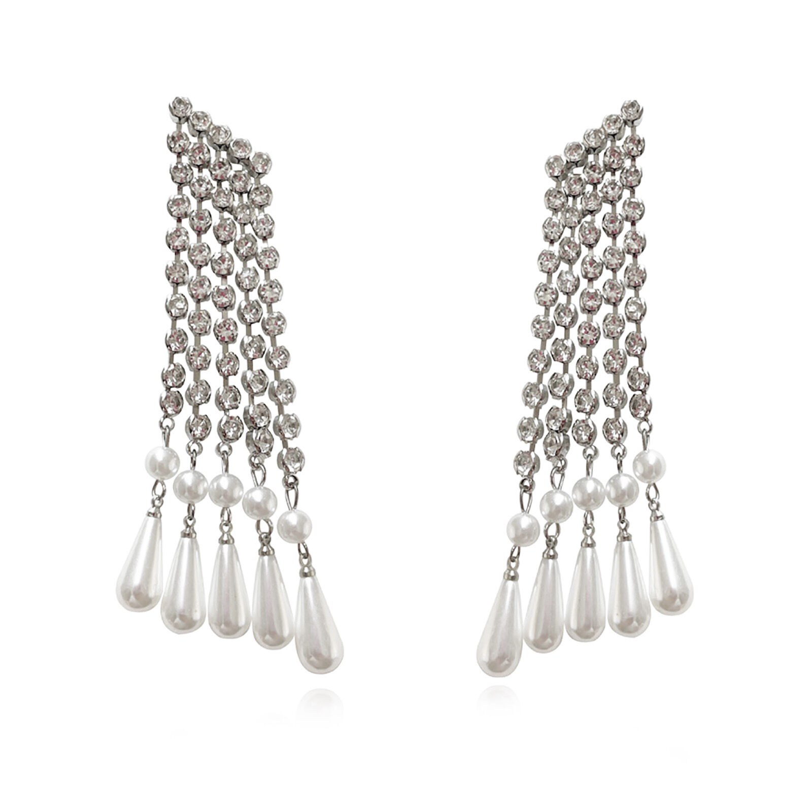 Add your splash of awesomeness to the world. Introducing Laurell Diamante Splash Earrings - a glam statement ear love adding a drama zest to your styling. This design features 5 strains of diamante tassels, each connected to a round and a drop-shaped faux pearls. The earrings are made in environmentally friendly stainless steel with sterling silver earring posts for hypoallergenic wear. Suitable for formal, semi-formal, dressy, chic, glamorous, runway, smart casual styles and more.