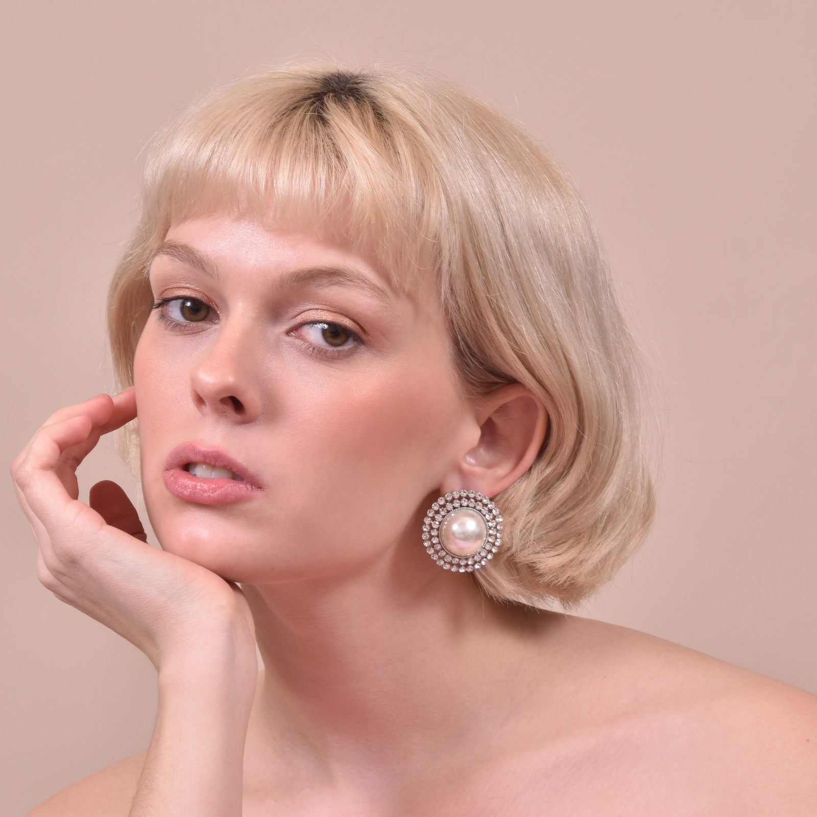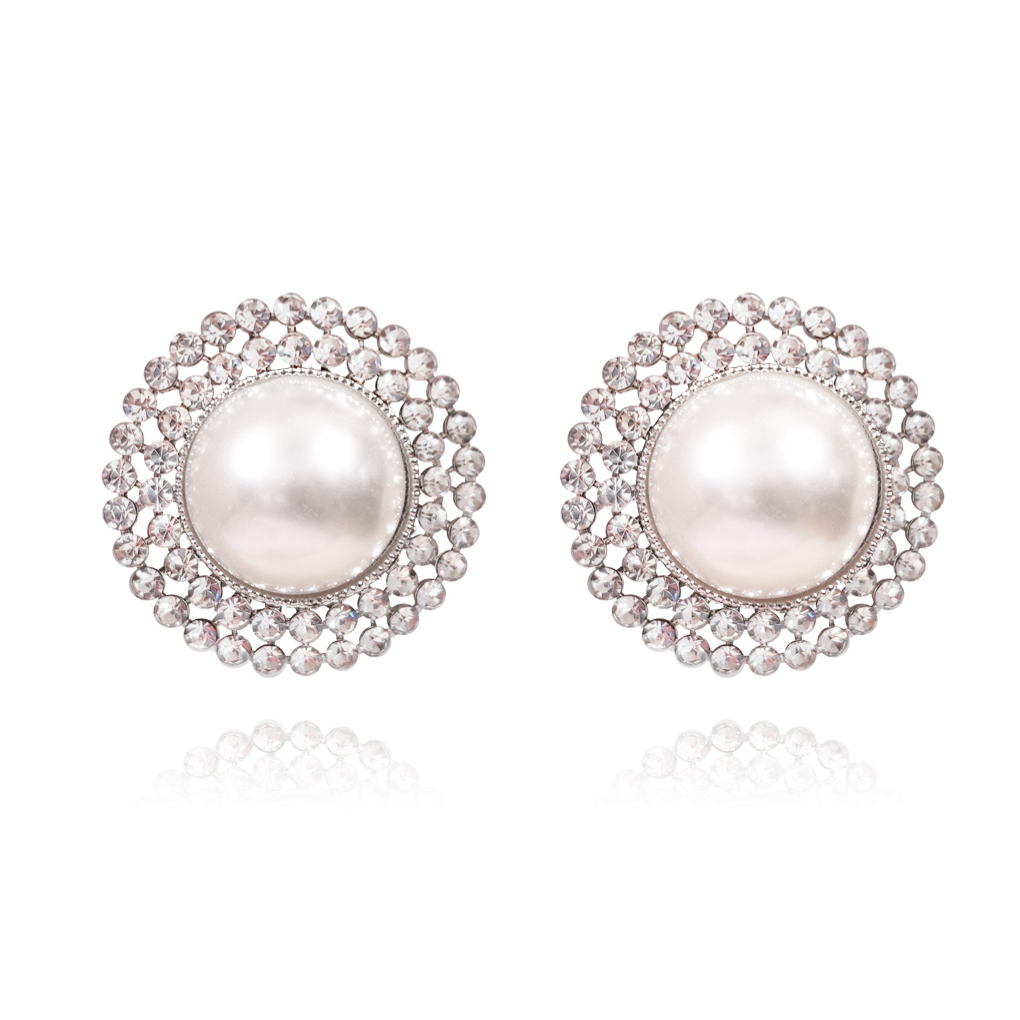 Vintage glamour with a sense of daring. Introducing Le Paris 60s Pearl Stud Earrings — a retro Parisian style pearly statement with an unforgettable shimmer. This design is crafted in environmentally friendly stainless steel (nickel free) with large faux pearls and cubic zirconia diamantes arrayed in a stunning circular fashion. Perfect for formal, semi-formal, wedding, bridal, dressy, vintage, high fashion, runway, chic styles and more.