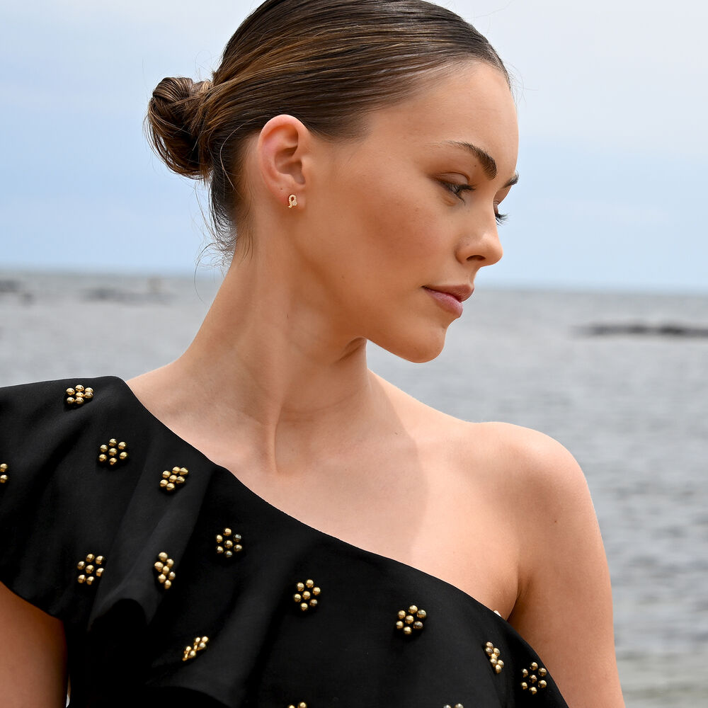 Each earring is meticulously crafted from solid sterling silver and finished with 2 microns of thick 18K gold plating, offering exceptional durability and a rich, luminous finish. The surface is set with Australian cubic zirconia pavé, creating a delicate constellation of light that catches and reflects with every movement.