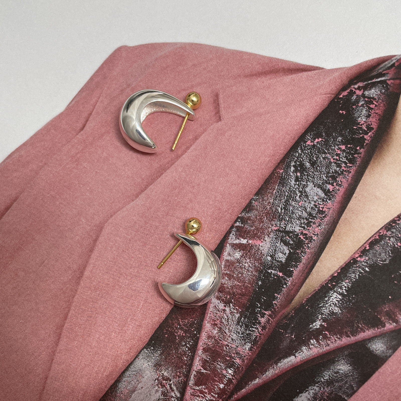 Introducing Leona Artsy Silver Bowl Earrings - a contemporary and timeless ear beauty for lovers of uniqueness and style. This design features a classic open bowl with a sleek curve and outline. The earrings are made in solid sterling silver with gold ear studs for an artsy combination of gold and silver. Precious white rhodium plating on the solid sterling silver also gives the earrings a brighter silver shine with an extra anti-tarnish protection. Perfect for style hunters who prefer something special and stay in trend all time. Hypoallergenic, nickel, lead, and cadmium free.