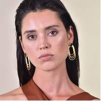 Loops within loops, covered in gold. Introducing Leora Artisan 24K Gold Layered Earrings - an artisan crafted piece with a highlight of natural black onyx gemstones. This design features 4 oval loops with varied length joined together at the top behind a natural black onyx gemstone nested in a diamond shaped pocket. The earrings are made of environmentally friendly brass (nickel free) with 24k pure gold plating. Perfect for modern, artsy, creative styling, high fashion, dressy, chic, punk, smart casual styles and more. Hypoallergenic, nickel, cadmium and lead free.