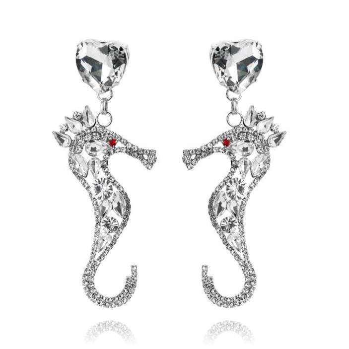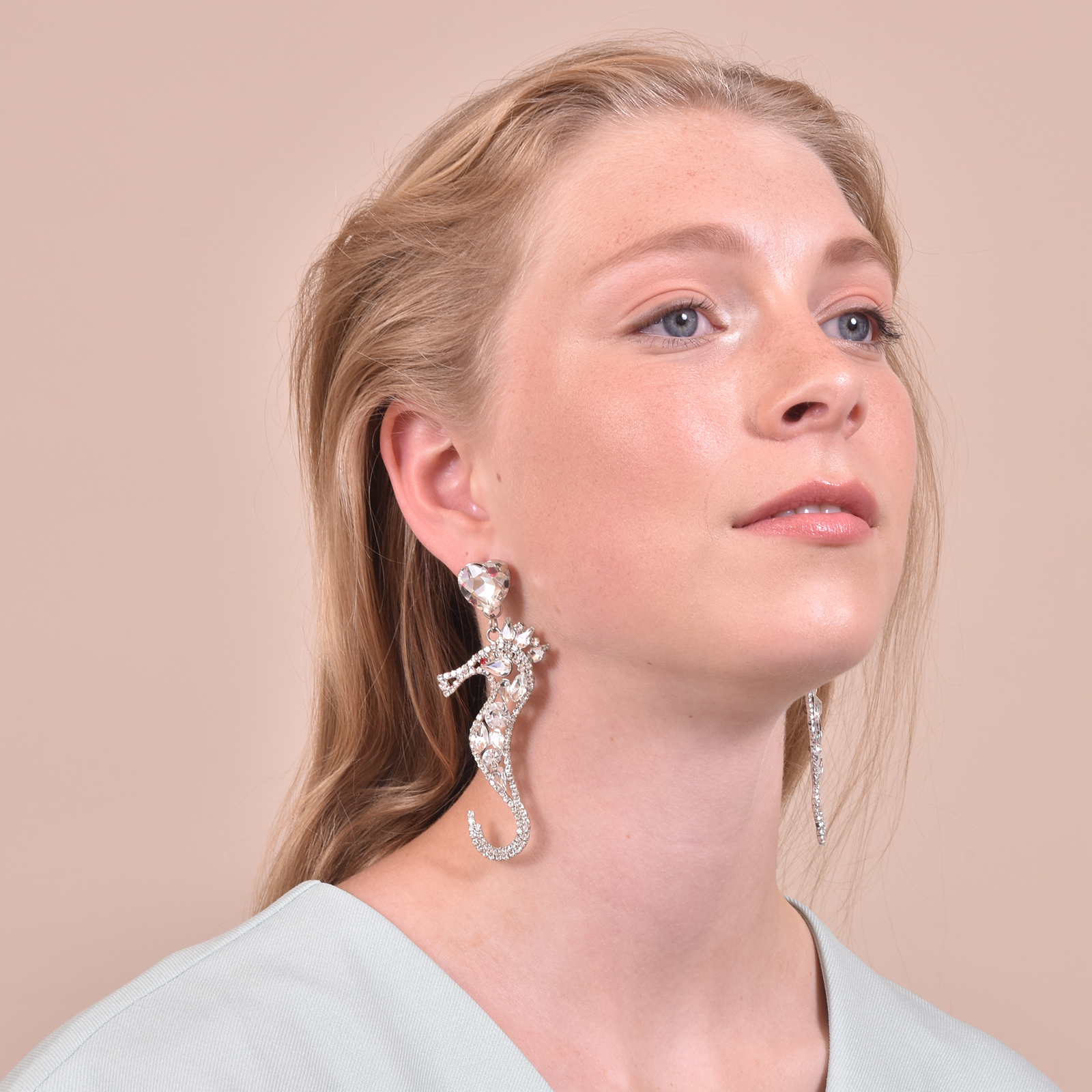 No earring kind of girls? Think twice! High fashion, fun and extravagant, Lexi Seahorse Rhinestone Drop Earrings are an eye-catching and fun statement piece you'll want to add in your accessory list. Make a powerful and exquisite fashion statement as fashion is meant to be fun and expressive. Perfect for formal, wedding, party, fashion events, racing and casual wear. Available for both pierced and non-pierced ears. Available for both pierced and non-pierced ears.