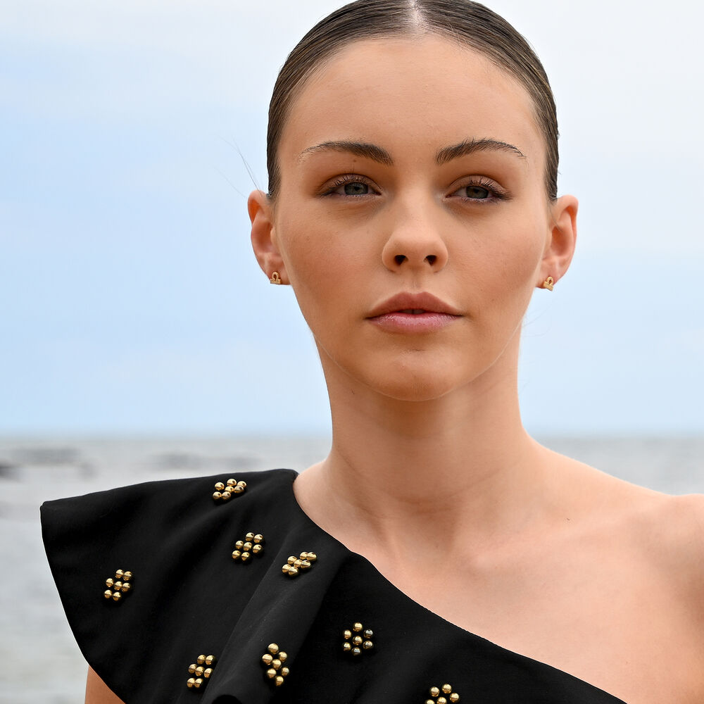 Each earring is meticulously crafted from solid sterling silver and finished with 2 microns of thick 18K gold plating, offering exceptional durability and a rich, luminous finish. The surface is set with Australian cubic zirconia pavé, creating a delicate constellation of light that catches and reflects with every movement.
