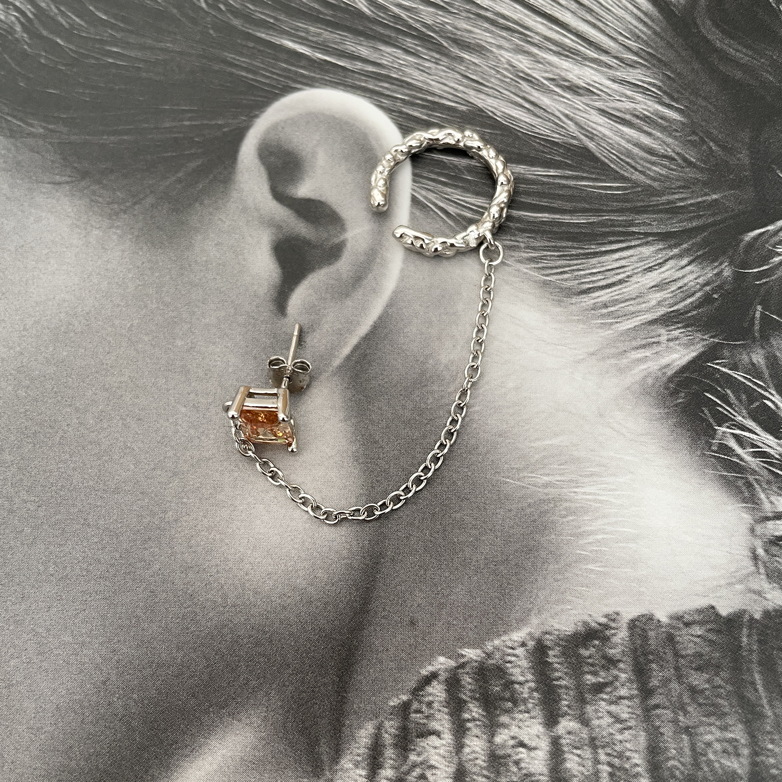Attitude is a little thing that makes a big difference. Introducing Lior Silver Topaz Chain Cuff Earring (Single Piece) - a contemporary artsy statement with a chic edginess. The design features a clear topaz stud connected to a textured C cuff via a fine link chain, forming a line curve around your ear. This ear piece is made of solid sterling silver. A unique and playful statement for modern, artsy, chic, minimalist, Nordic, punk, earring layering, earring mismatching, smart casual, casual styles and more. Hypoallergenic, nickel, cadmium and lead free. Also suitable for unisex wear.