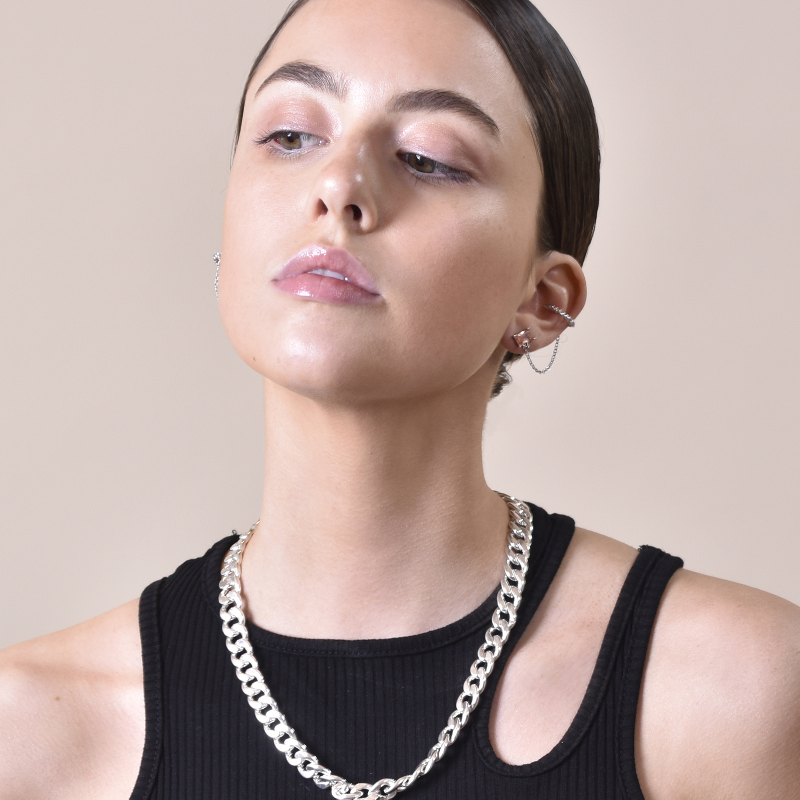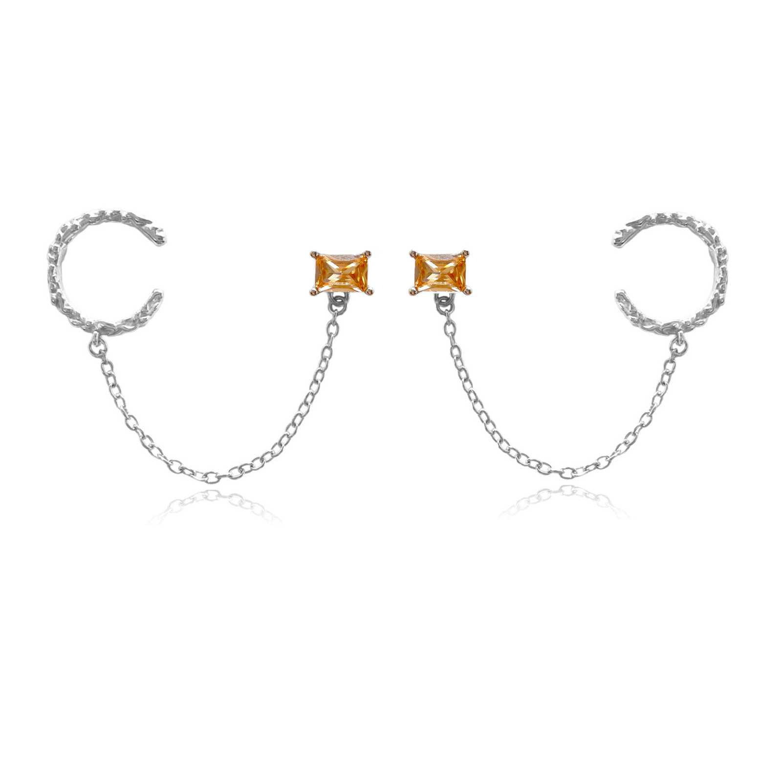 Attitude is a little thing that makes a big difference. Introducing Lior Silver Topaz Chain Cuff Earrings - a contemporary artsy statement with a chic edginess. The design features a clear topaz stud connected to a textured C cuff via a fine link chain, forming a line curve around your ear. The earrings are made of solid sterling silver. A unique and playful statement for modern, artsy, chic, minimalist, Nordic, punk, earring layering, earring mismatching, smart casual, casual styles and more. Hypoallergenic, nickel, cadmium and lead free. Also suitable for unisex wear.
