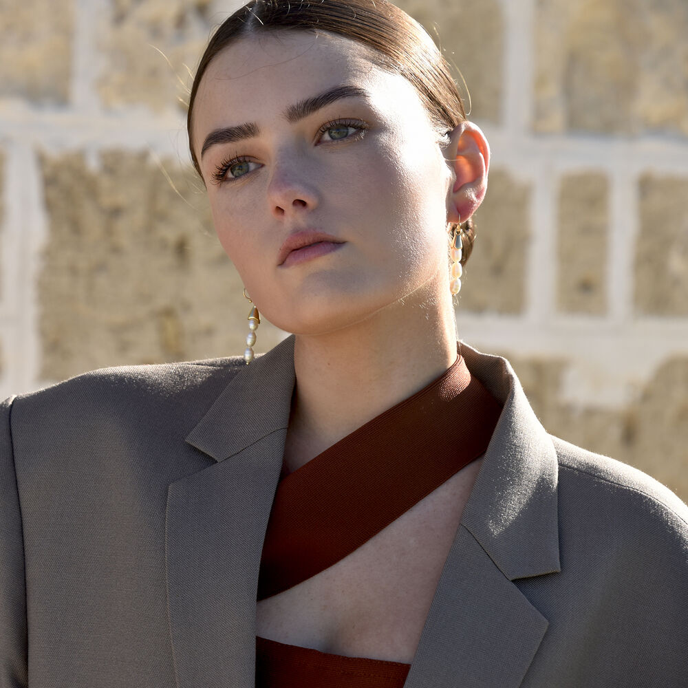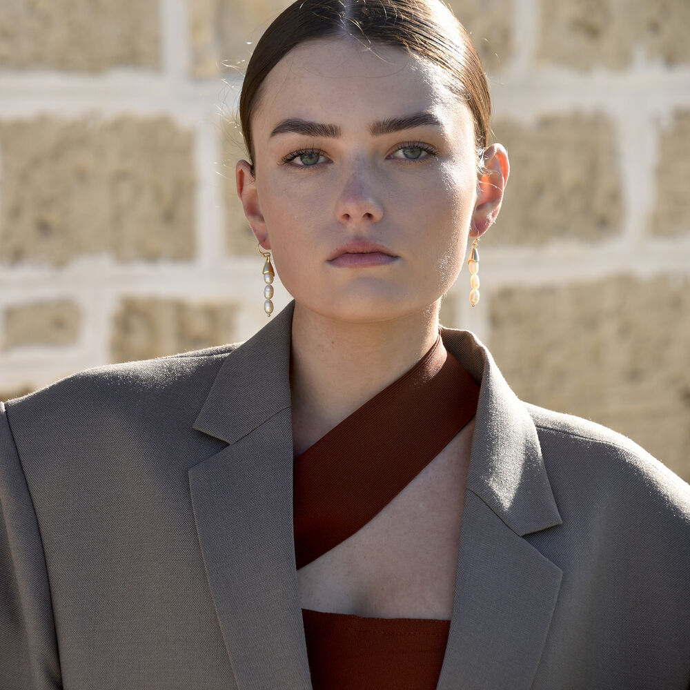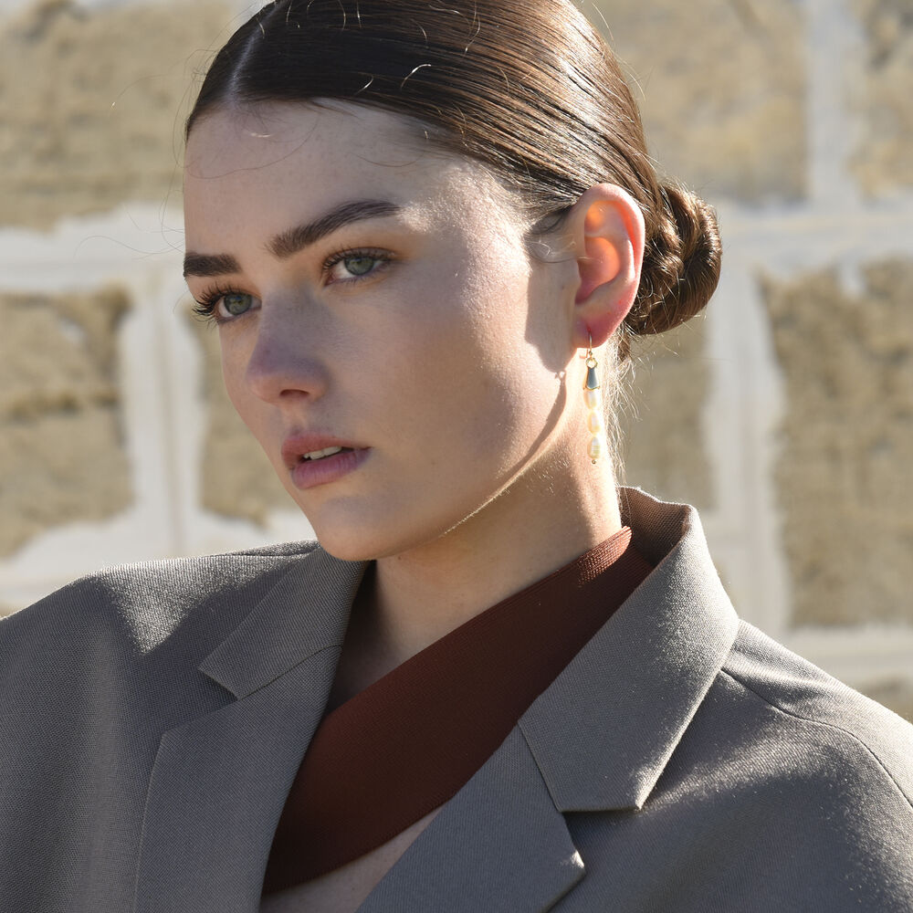 From serenity comes gentleness and lasting strength. Introducing Loire Pearl Drop Earrings - a pearl design that carries quiet power within. This design features 3 cultured freshwater pearl drops with the top pearl embedded under a pod-shaped metal cap. The earrings are made in environmentally friendly brass with 18ct gold plating with an ear hook insert. Suitable for semi-formal, coastal, feminine, modern, vintage, coastal, smart casual, causal styles and more.