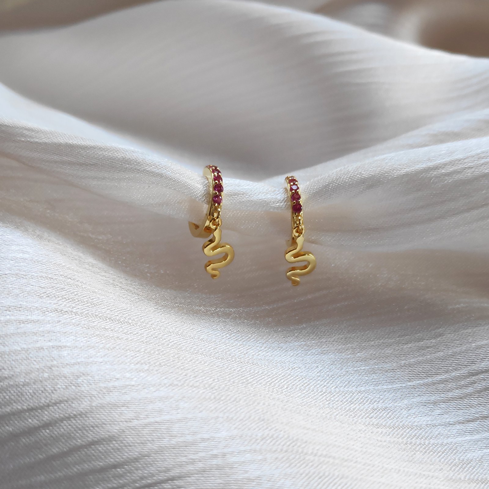 Calling snake lovers! introducing Lois Gold Filled Snake Drop Earrings - a dainty ear love that is slightly mysterious and sophisticated in details. This delicate design is crafted in sterling silver with 14K gold filled as a thicker gold bond, which gives it a smooth, subtle and long-lasting gold shine. The fuchsia cubic zirconia decorated hoops also make a 2nd highlight, adding a sense of vibrance to the whole vibe. Perfect for minimalism, everyday, punk and casual styles; and for modern muses who have multiple ear piercings on one ear.