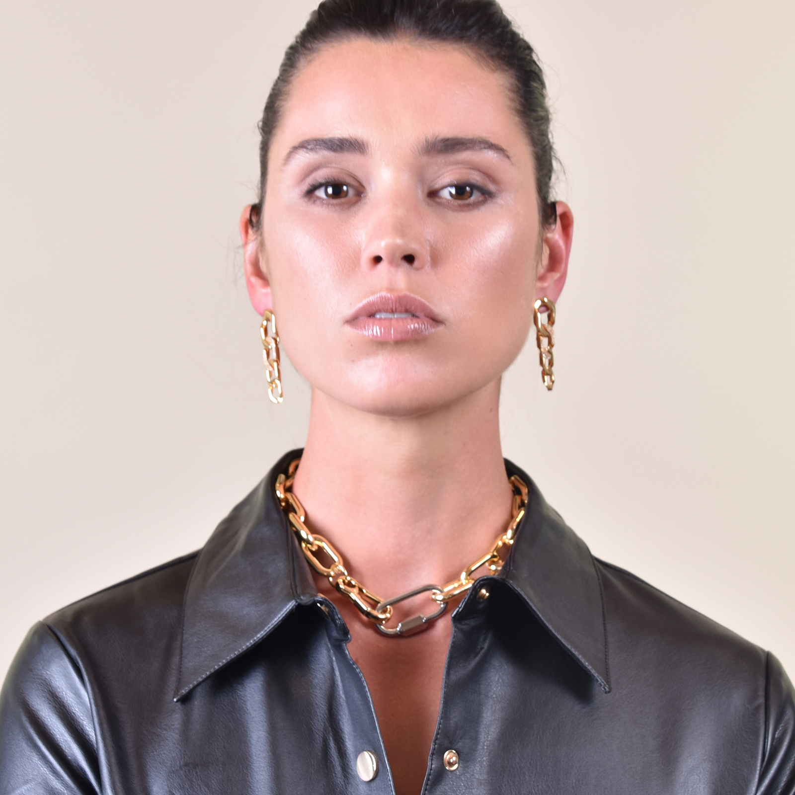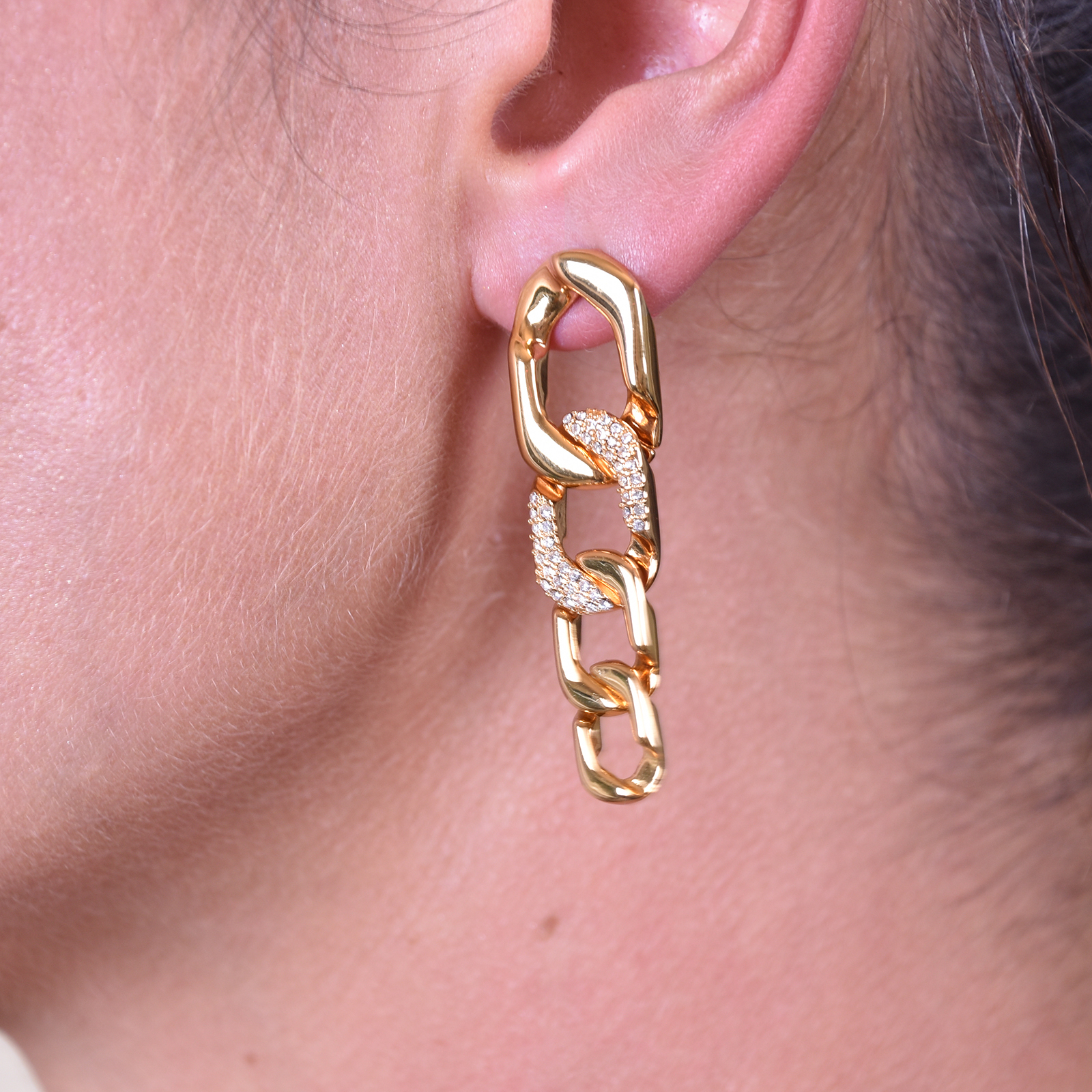 Premium quality with a punchy edginess. Introducing London 18K Diamante Chain Drop Earrings — a contemporary link chain style for trendy modern muses who appreciate quality. This design features 4 downsizing linked gold chains made of titanium steel with 2.5 microns of 18k gold plating. The second chain from the top is embellished with cubic zirconias for a gorgeous shimmer. The metal surface is highly polished to best bring out the 18k yellow gold shine. The earring posts are made of solid sterling silver with for hypoallergenic wear. Perfect for modern, retro, chic, punk, high fashion, smart casual styles and more. Hypoallergenic, nickel, cadmium and lead free.