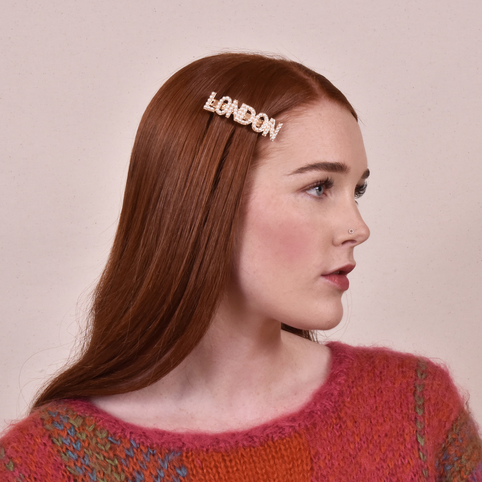 Hair statement easily done! Introducing London Pearly Statement Barrette - a modern and eye-catching hair accessory for every stylish girl who loves to stand out in a crowd. This piece features a contemporary gold letter clip decorated with simulated pearls forming ‘London’. A hair zest piece for fashionistas of all ages.