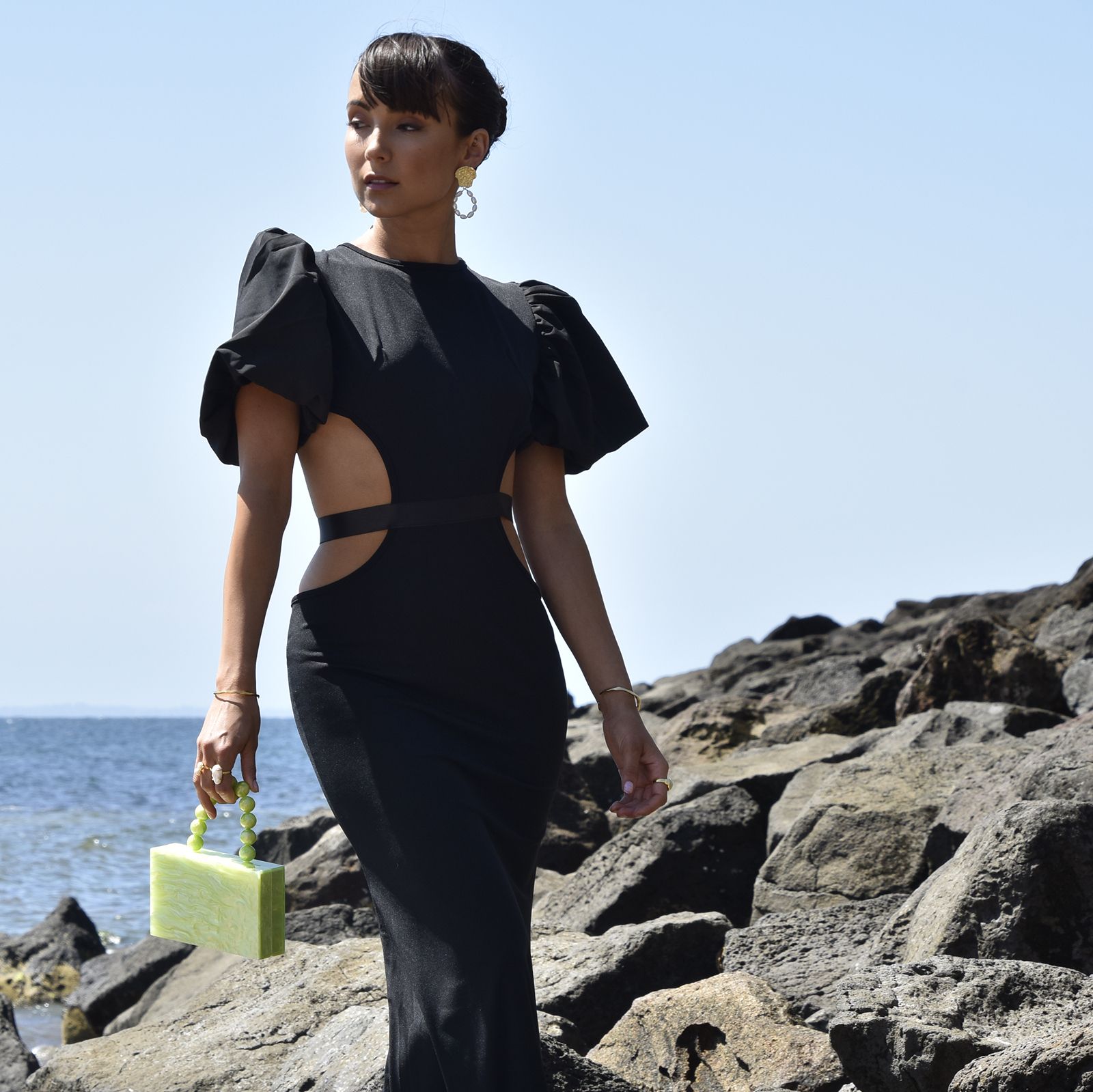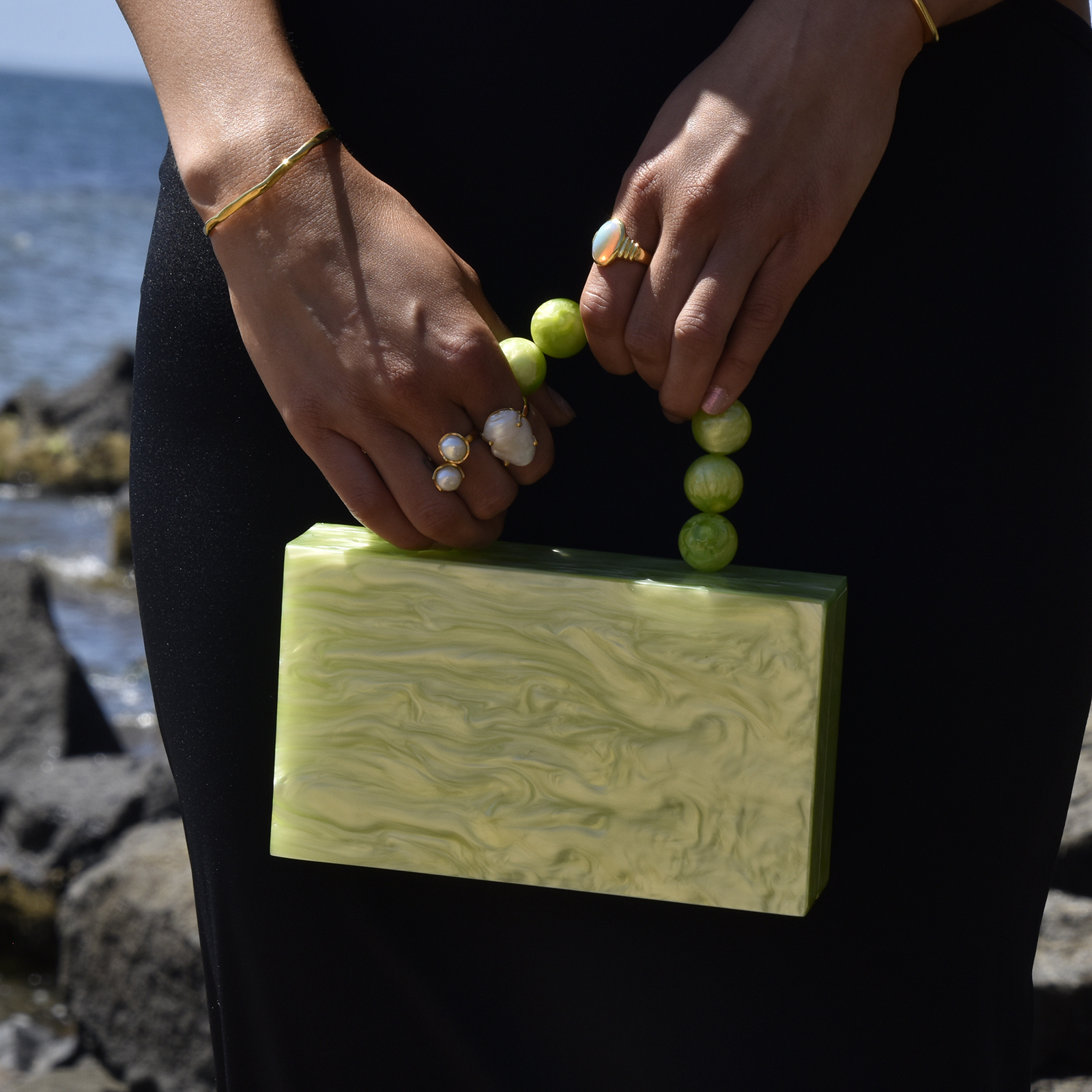 Sold OutVibrant, chic and unique. Introducing Lorena Artsy Resin Clutch (Lime Green) - a contemporary style resin bag that makes an eye-catching style highlight. This design features a rectangular shaped clutch bag with a handle made of resin beads. It comes in 3 different colours: emerald green, lime green and neutral shimmer. A chic, sweet and adorable accessory perfect for formal, semi-formal, dressy, feminine, girly, creative, high fashion, fashion events, smart casual, casual style and more.