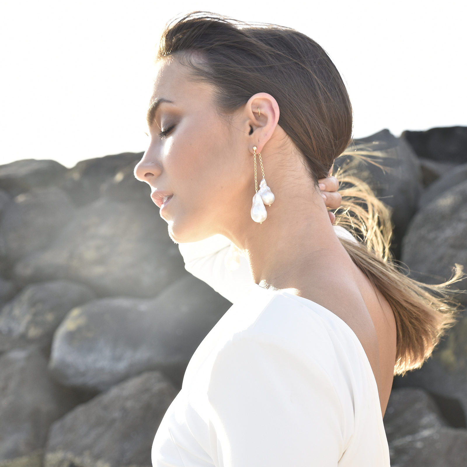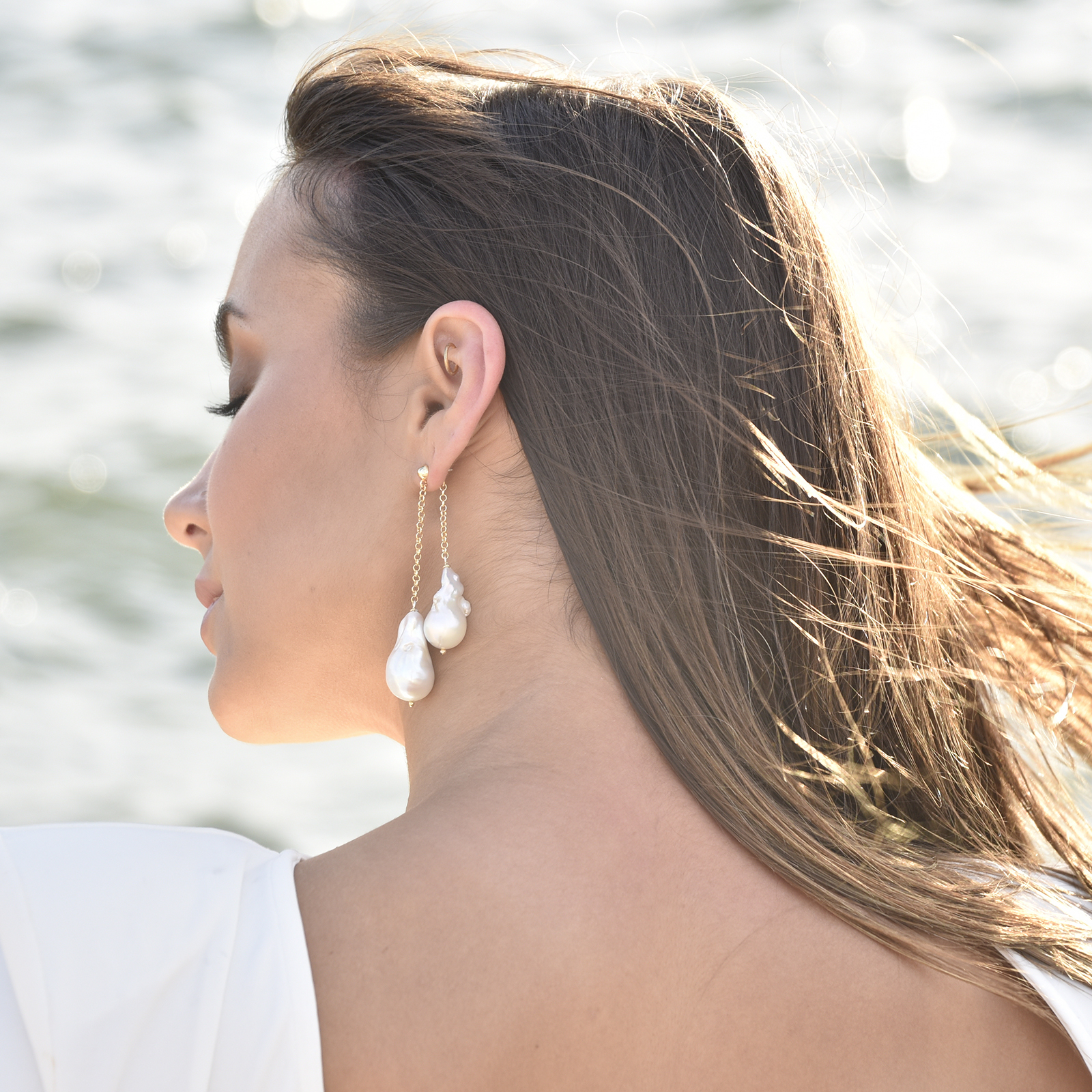 Take your elegant pearl style to another level. Introducing Lorene Luxury 24K South Sea Twin Baroque Pearl Earring (Single Piece) - an artisan handcrafted natural baroque pearl ear love that is head-turning and unforgettable. This luxury design features handpicked premium quality South Sea baroque pearls that have smooth surface and a stunning high lustre. Each baroque pearl is connected with a gold link made in solid sterling silver with pure 24K gold plating. This earring is worn as a front and back style with the front chain slightly longer than the back chain. A feminine and striking pearl statement perfect for modern, dressy, formal, semi-formal, wedding, bridal, red carpet, fashion events, high fashion styling and more. Hypoallergenic, nickel, cadmium and lead free.