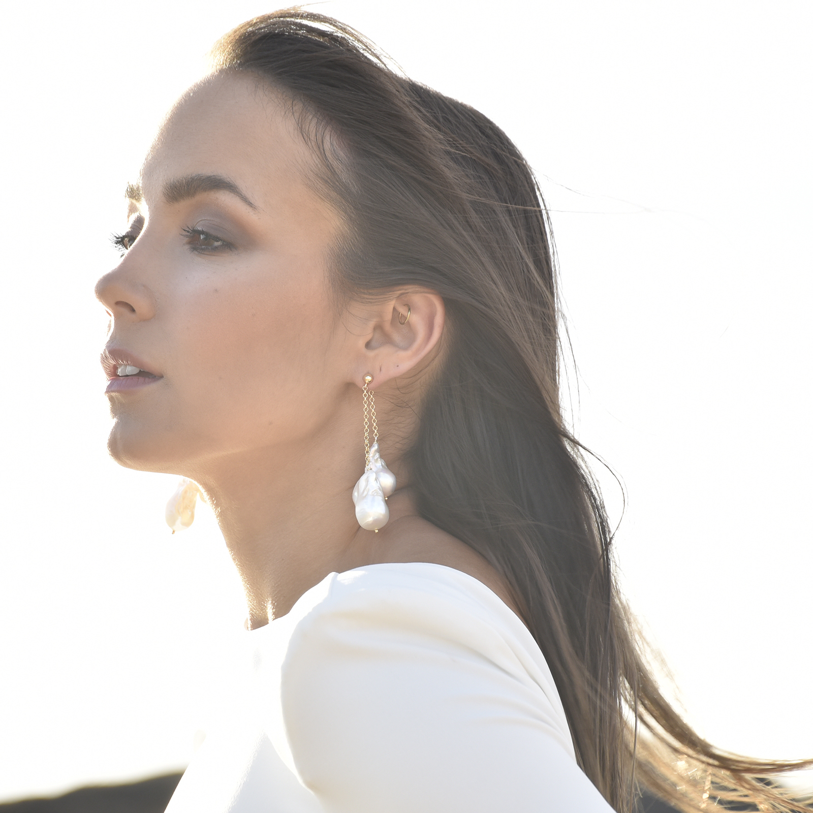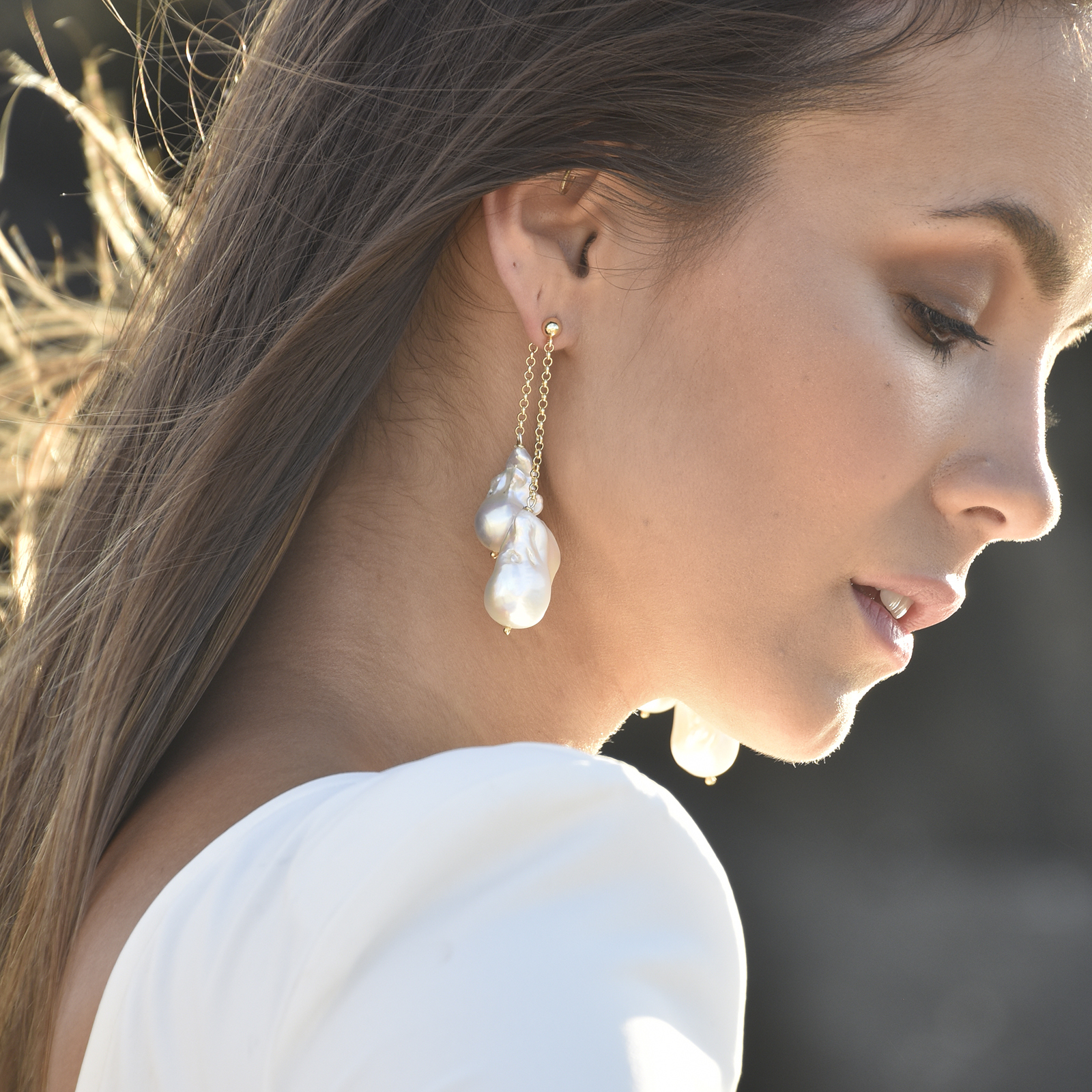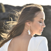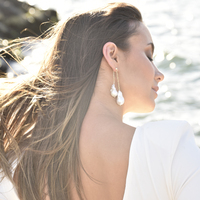 Take your elegant pearl style to another level. Introducing Lorene Luxury 24K South Sea Twin Baroque Pearl Earrings - an artisan handcrafted natural baroque pearl ear love that is head-turning and unforgettable. This luxury design features handpicked premium quality South Sea baroque pearls that have smooth surface and a stunning high lustre. Each baroque pearl is connected with a gold link made in solid sterling silver with pure 24K gold plating. This earring is worn as a front and back style with the front chain slightly longer than the back chain. A feminine and striking pearl statement perfect for modern, dressy, formal, semi-formal, wedding, bridal, red carpet, fashion events, high fashion styling and more. Hypoallergenic, nickel, cadmium and lead free.