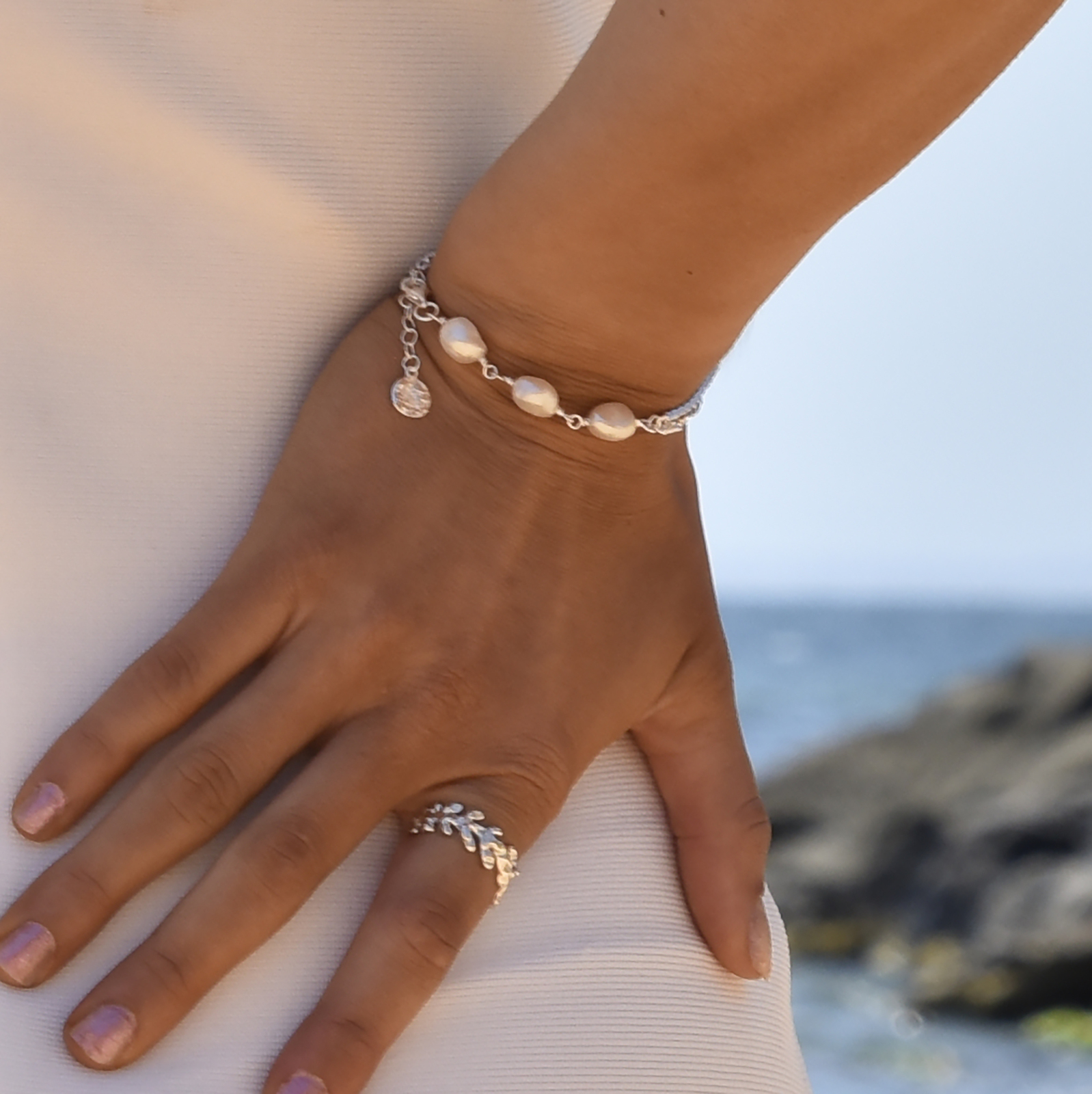 | Made from: | Solid Sterling SilverNatural Freshwater PearlsWhite Rhodium Plating |