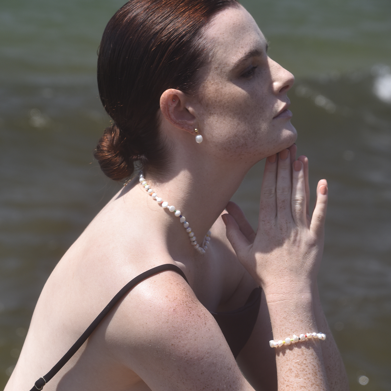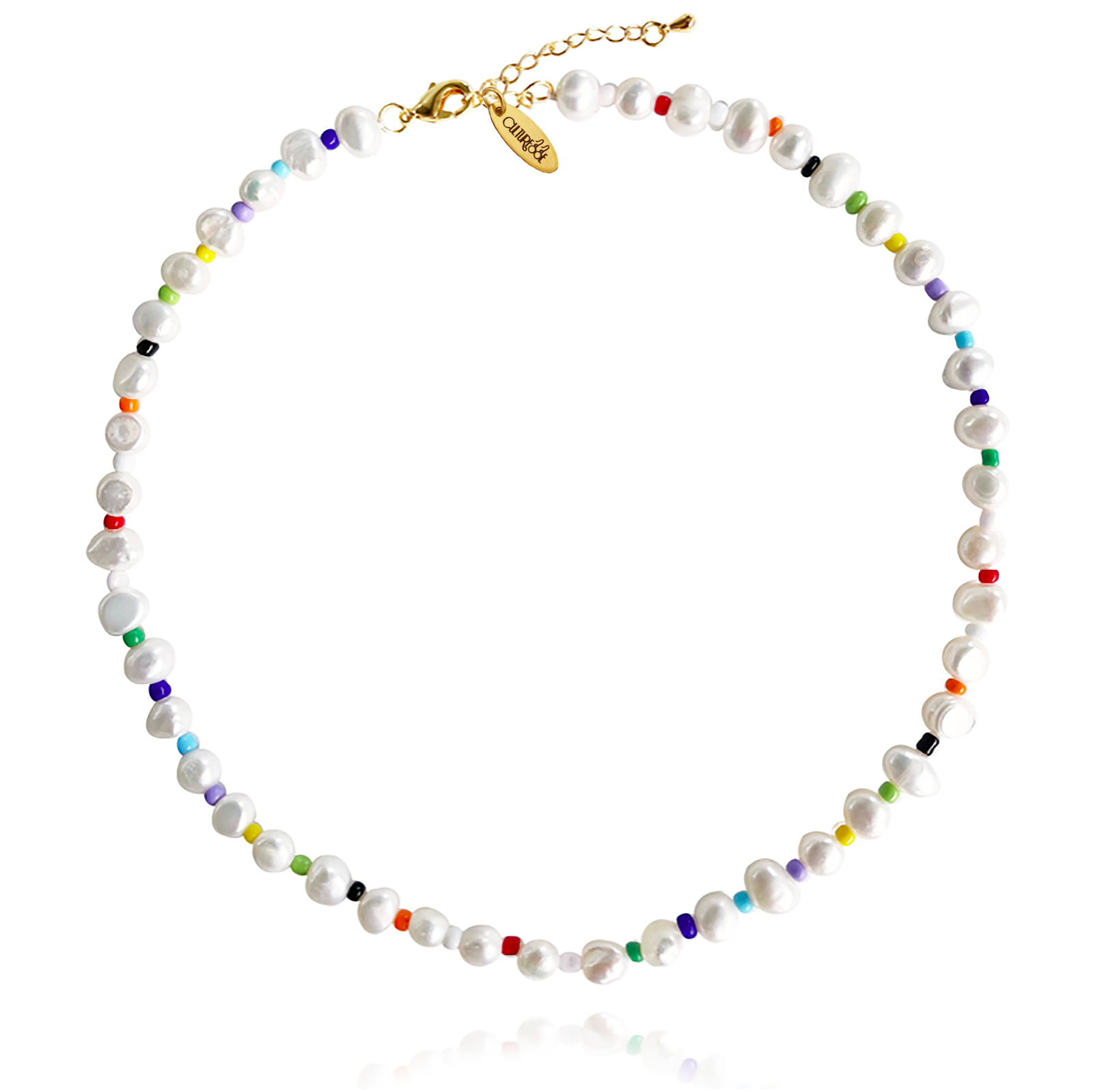Coastal chicness with pearl elegance and a splash of brightness. Introducing Loxie Coastal Muse Beaded Pearl Necklace - an artisan hand-threaded natural pearl love for a vibrant coastal vibe. This design features natural freshwater pearls separated by colourful threading beads, adding a vibrancy and playfulness to your styling. The link chain and clasp are made in environmentally friendly brass with 18K gold plating. Perfect for modern, coastal, beach, bohemian, summer, chic, necklace layering, smart casual, casual styles and more.