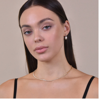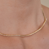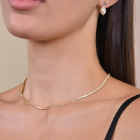 Fine shimmering glamour for an elevated everyday styling. Introducing Lucille Gold Filled Diamante Necklace / Choker — a feminine and delicate neckpiece for lovers of fine style. This piece features high quality pave clear zircons that add a subtle and gorgeous shimmer to your neck. The metal used is environmentally friendly brass (nickel free) with 14K rolled gold (filled gold) to form a thicker gold bond to the metal. Perfect for formal, semi-formal, dressy, feminine, chic, modern, necklace overlay, smart casual styles and more. Hypoallergenic, nickel, cadmium and lead free.
