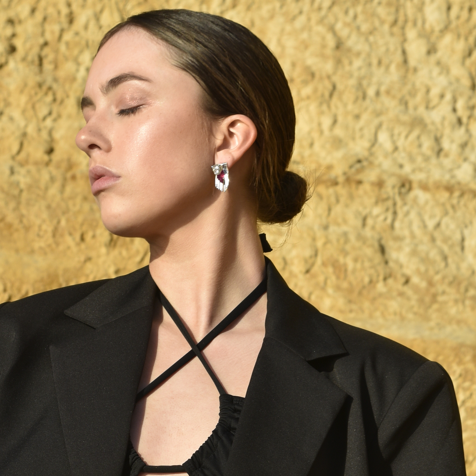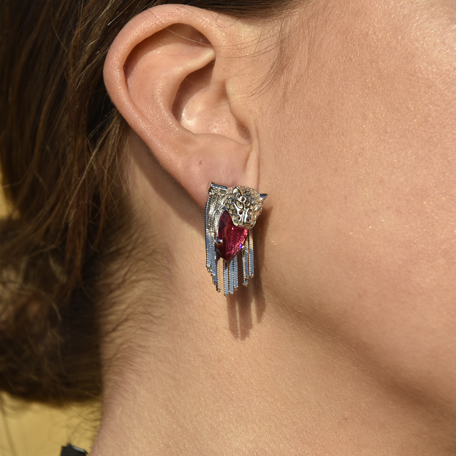 Fierce, exquisite and one of a kind. Introducing Ludovica Luxury Snow Leopard Crystal Earrings - a luxury style ear art with exceptional high quality. This design embodies snow leopard head features with silver tassels and Austrian rose-toned crystals. The earrings are made of solid sterling silver with a brilliant rhodium plating, made to last for a lifetime. An edgy and high fashion ear love with mega vibes. Perfect for luxury, high fashion, artsy, punk, creative styling, runway, red carpet events, evening, dressy, smart casual styles and more. Hypoallergenic, nickel, cadmium and lead free.