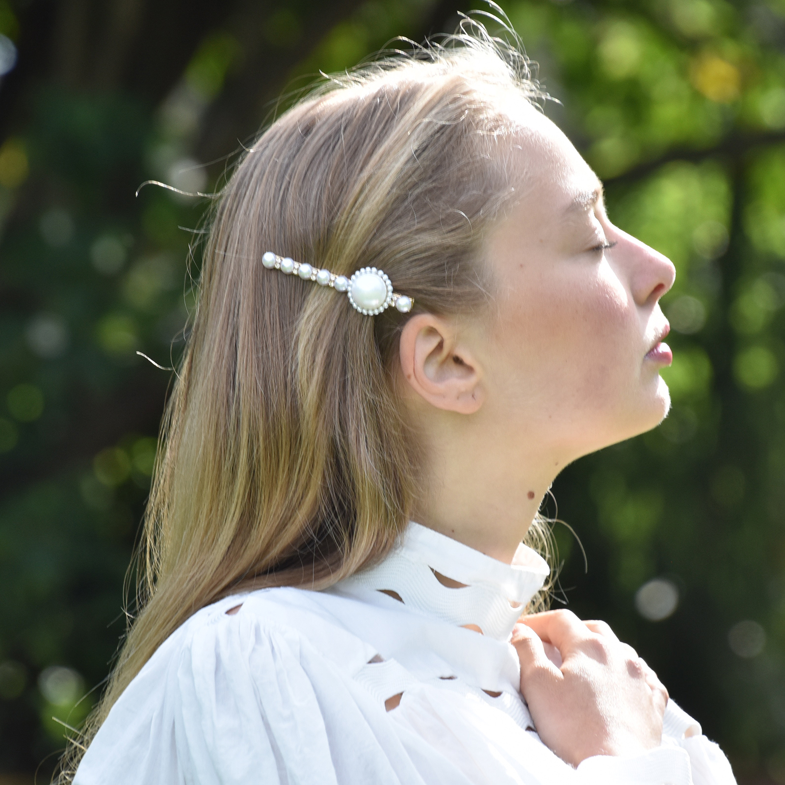 An elegant pearly barrette that is chic and charming. Introducing Lux Vintage Pearly Barrette – a sweet piece for pearly style muses who love to accessorise. This piece features a row of simulated pearls with a big round faux pearl at the end – holding your hair while adds a subtle shine. Perfect for modern, vintage, chic, girly, casual styles and more. Suitable for kids and teens.