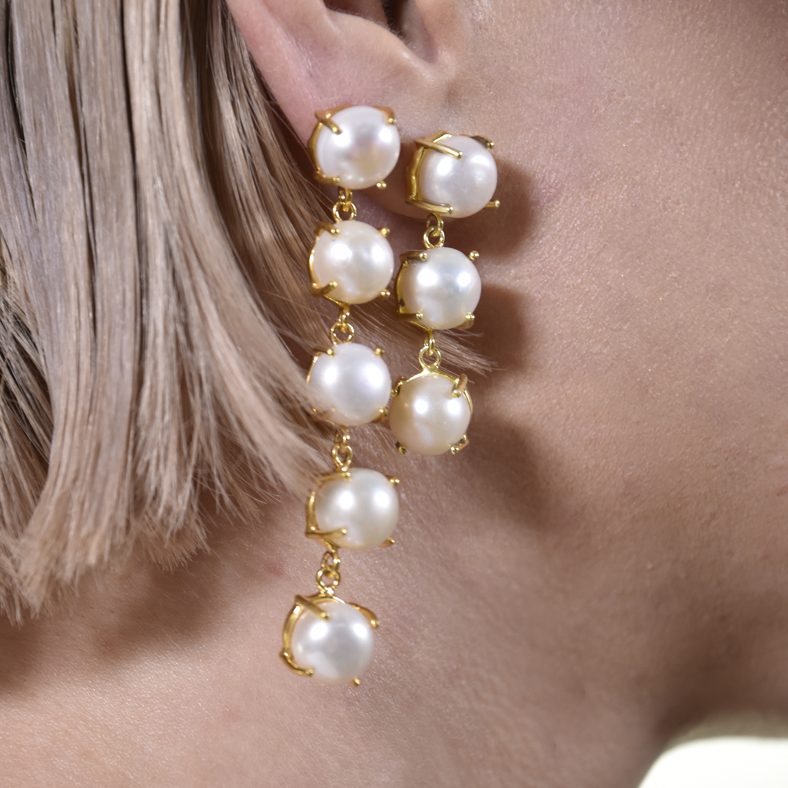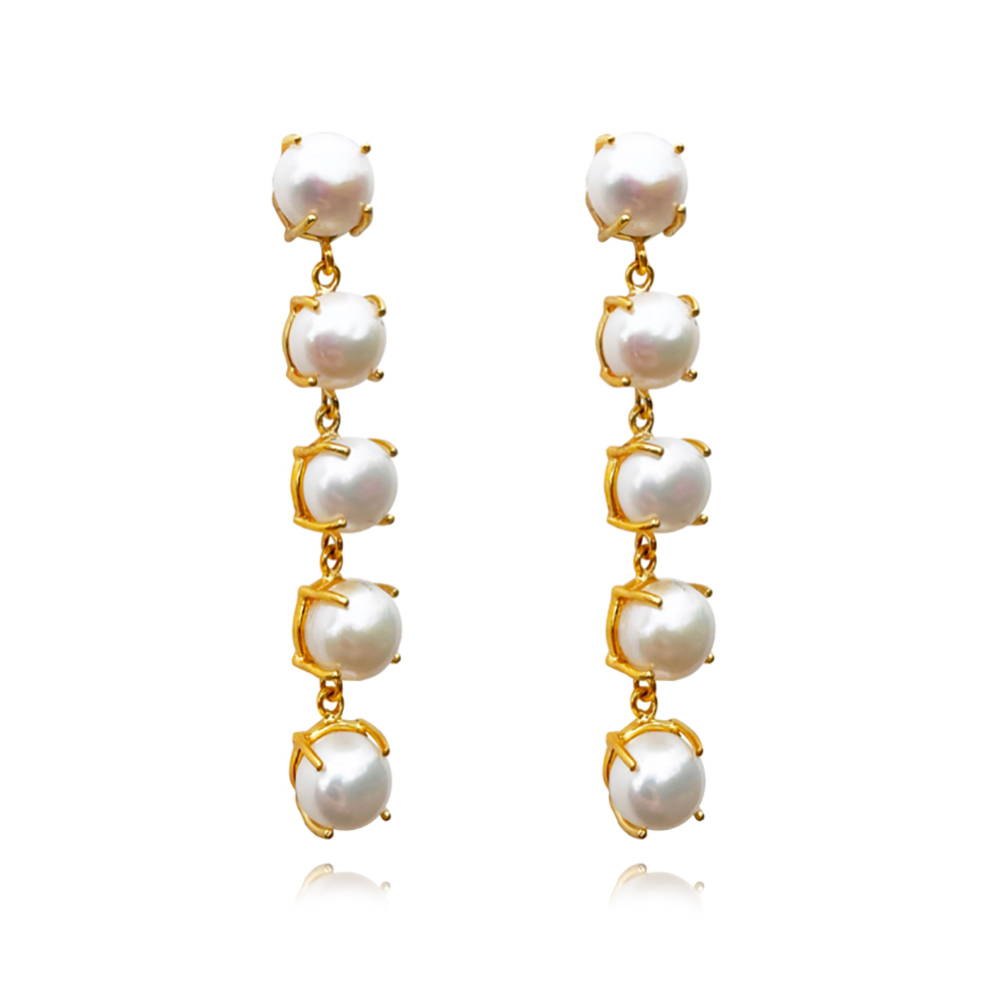 Pearl elegance in a chic and classy drop. Introducing Lyanna 22K Premium Pearl Drop Earrings (5 Pearls) - an artisan handcrafted natural pearl beauty for your elegant and timeless styling. This design features premium quality (AAA+ grade) natural Mediterranean freshwater pearls in a claw setting. Each pearl is handpicked to ensure consistent size, smooth surface and a gorgeous natural lustre. The earrings are made in environmentally friendly brass with 2.5 microns of 22K gold plating (heavy gold plated to premium jewellery standards). The earring posts are made in solid sterling silver with 22K gold plating for hypoallergenic wear. Perfect for modern, retro, formal, semi-formal, dressy, bridal, bridesmaids, wedding, fashion events, feminine, coastal, mismatching, smart casual styles and more. Hypoallergenic, nickel, lead, and cadmium free.