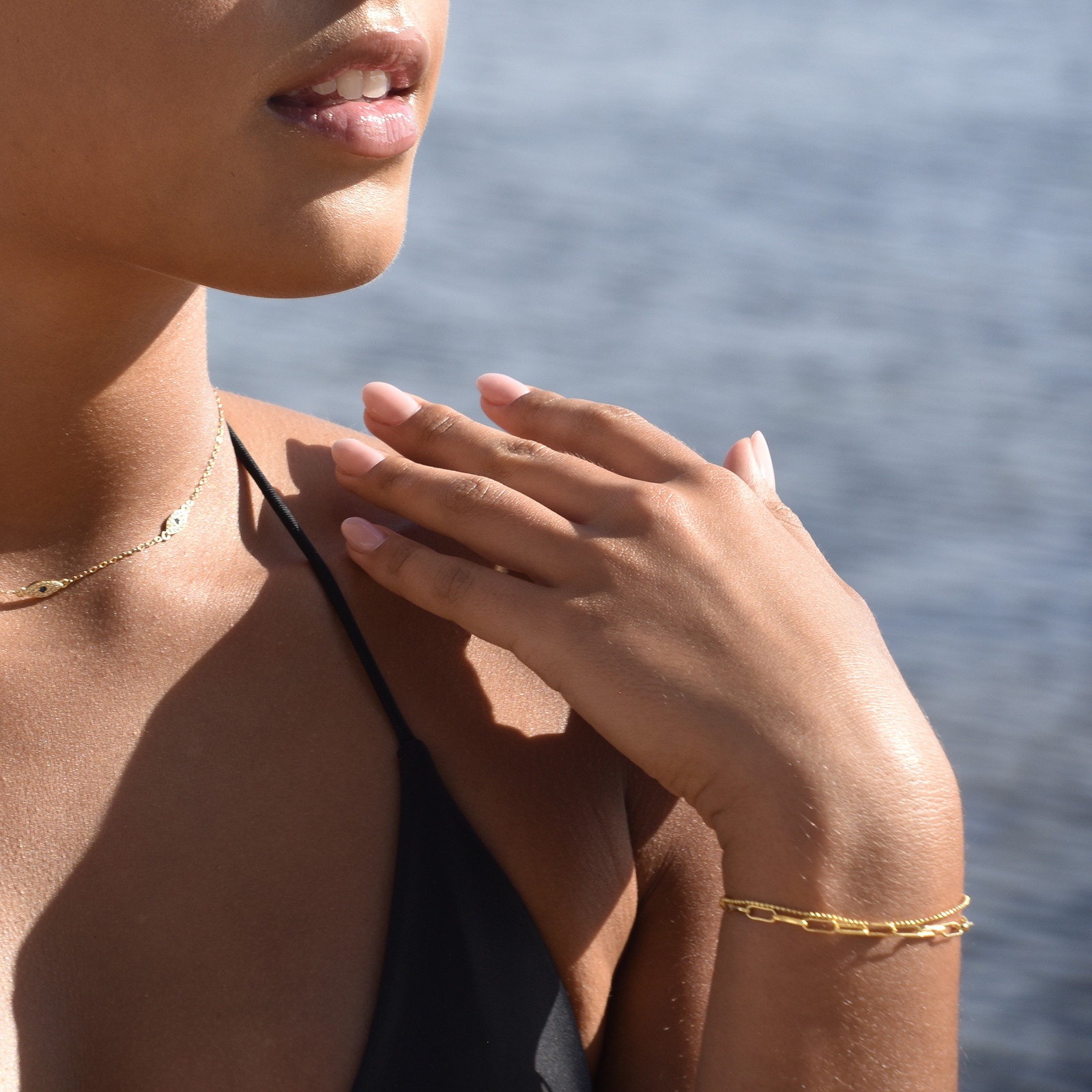 Everyday fineness with chic details. Introducing Mabel Fine Gold Twin Line Bracelet - a delicate and on-trend fine chain wrist love for your elevated chic styling. This design features a twin link chain - one with oval links, and one with fine beads, connected at both ends. This bracelet is made in sterling silver with 18K gold plating for a noble gold shine and hypoallergenic wear. It is 17.5cm long including a 4cm adjustable link. Suitable lovers of fine styles, layering and everyday wear. Hypoallergenic, nickel, lead, and cadmium free.