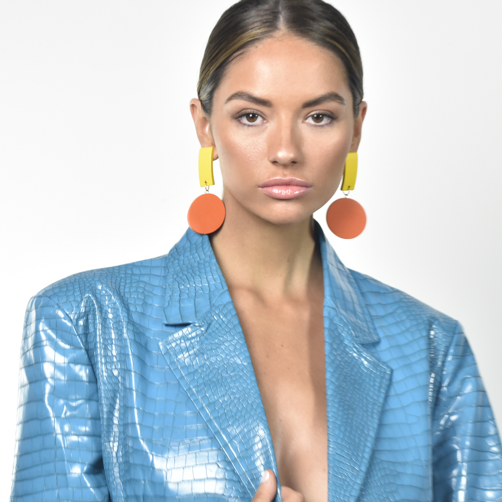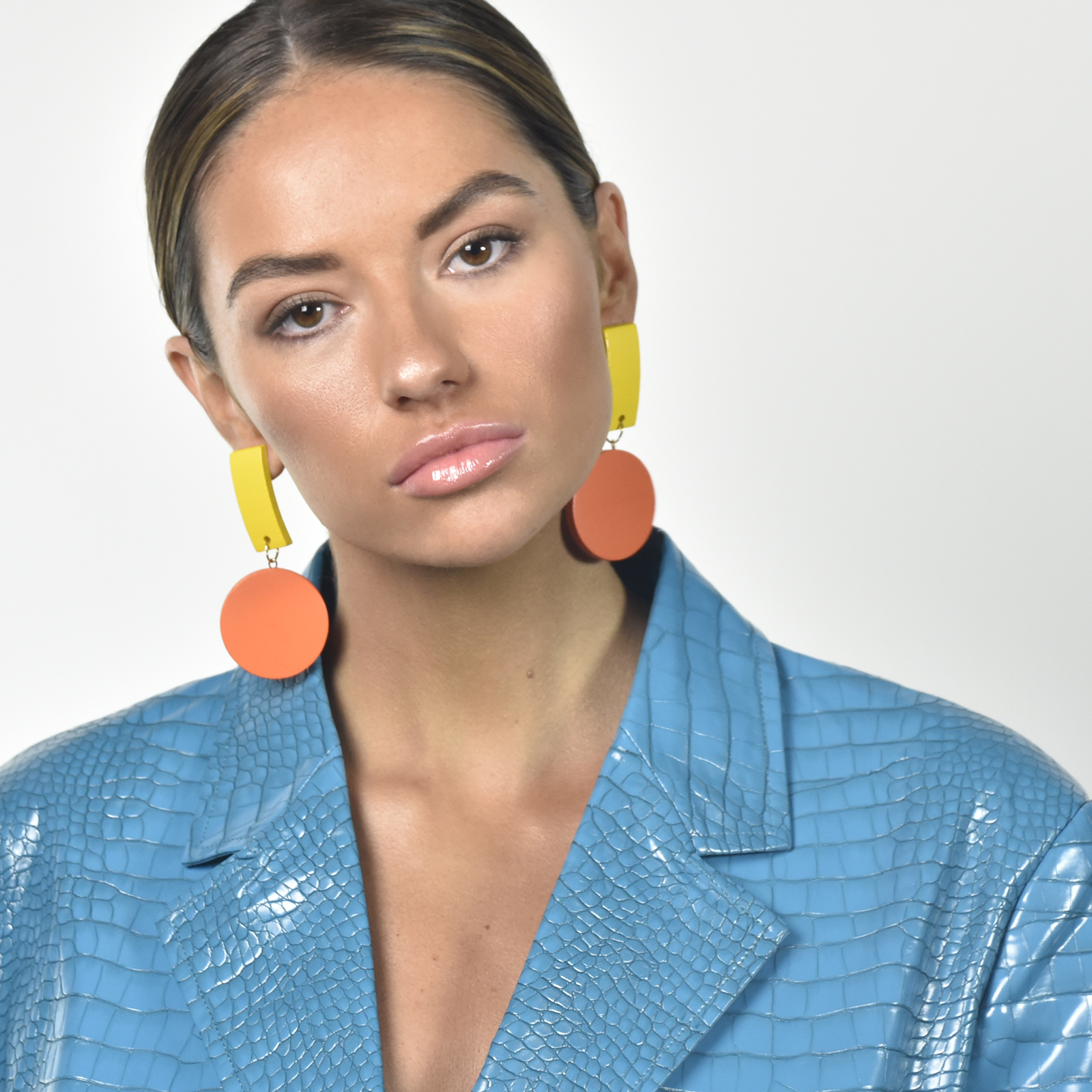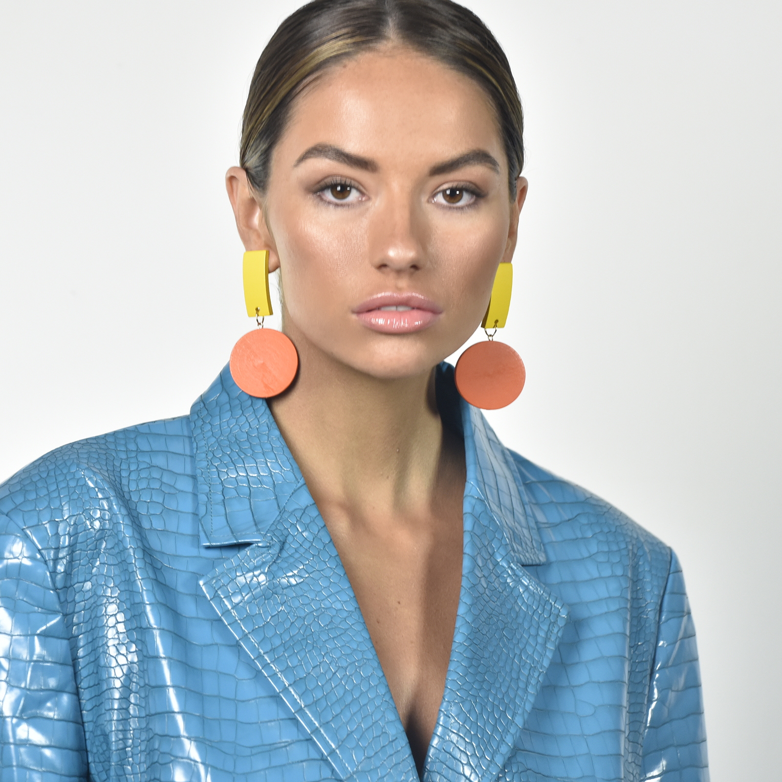 Brighten your styling with an eye-catching drama drop. Introducing Maci Geo Oversized Wood Craft Earrings - an oversized contemporary style ear love bringing fun and drama to your styling. This design features a lightly curved vertical rectangular top connected with a round drop, crafted in wood. Despite the big size, each earring is 6.6g in weight, making it light and comfortable when wearing. The earrings come with surgical steel earring posts for hypoallergenic wear. Perfect for lovers of statement and colours.